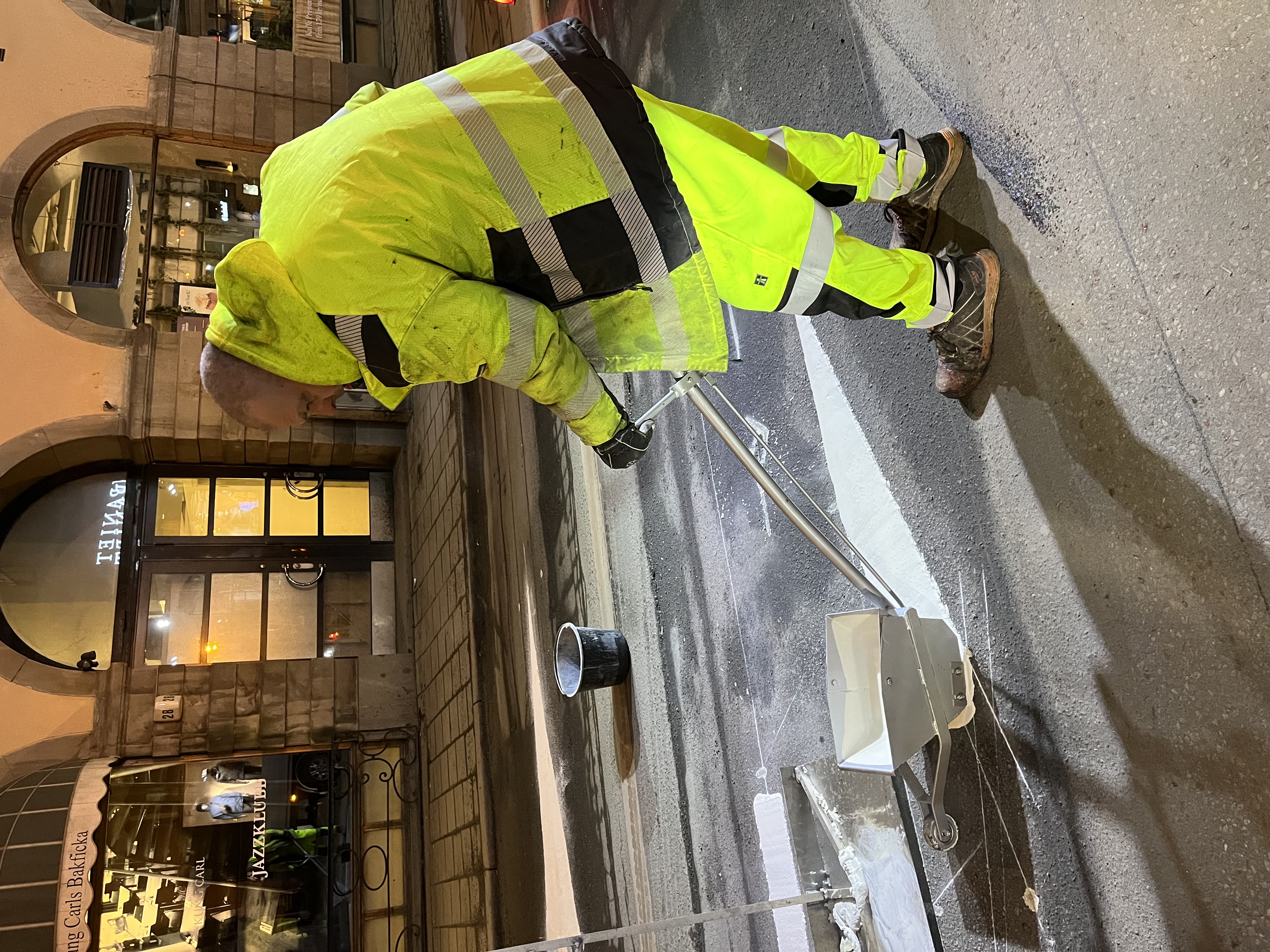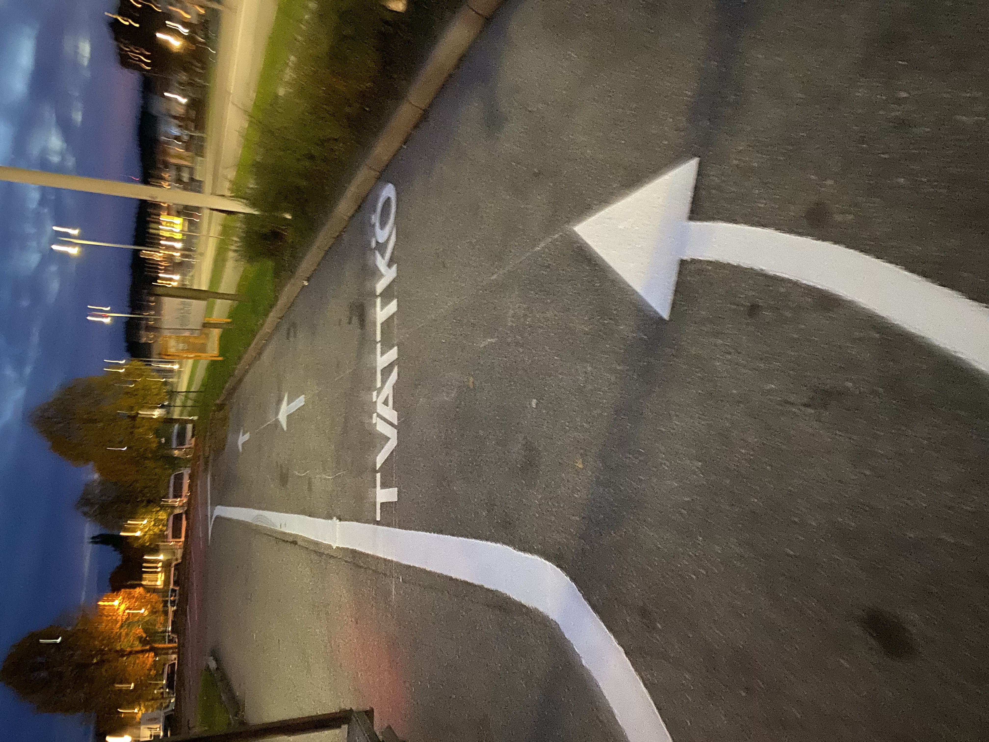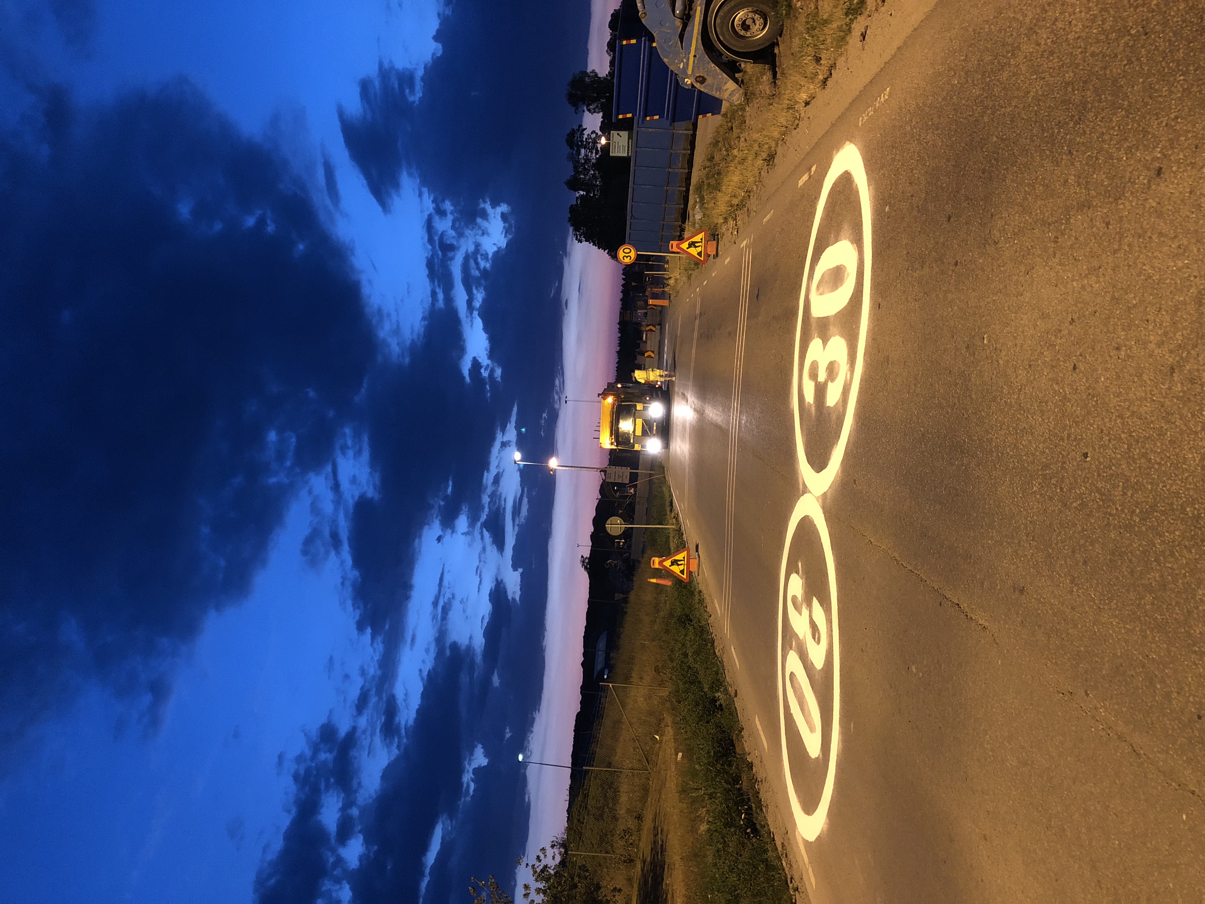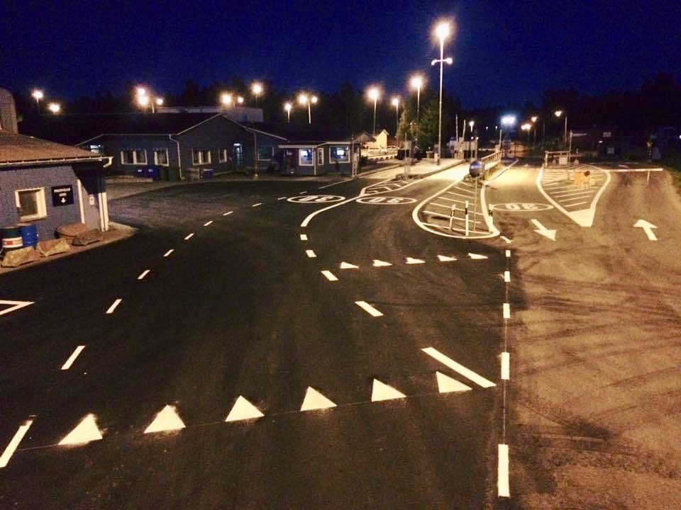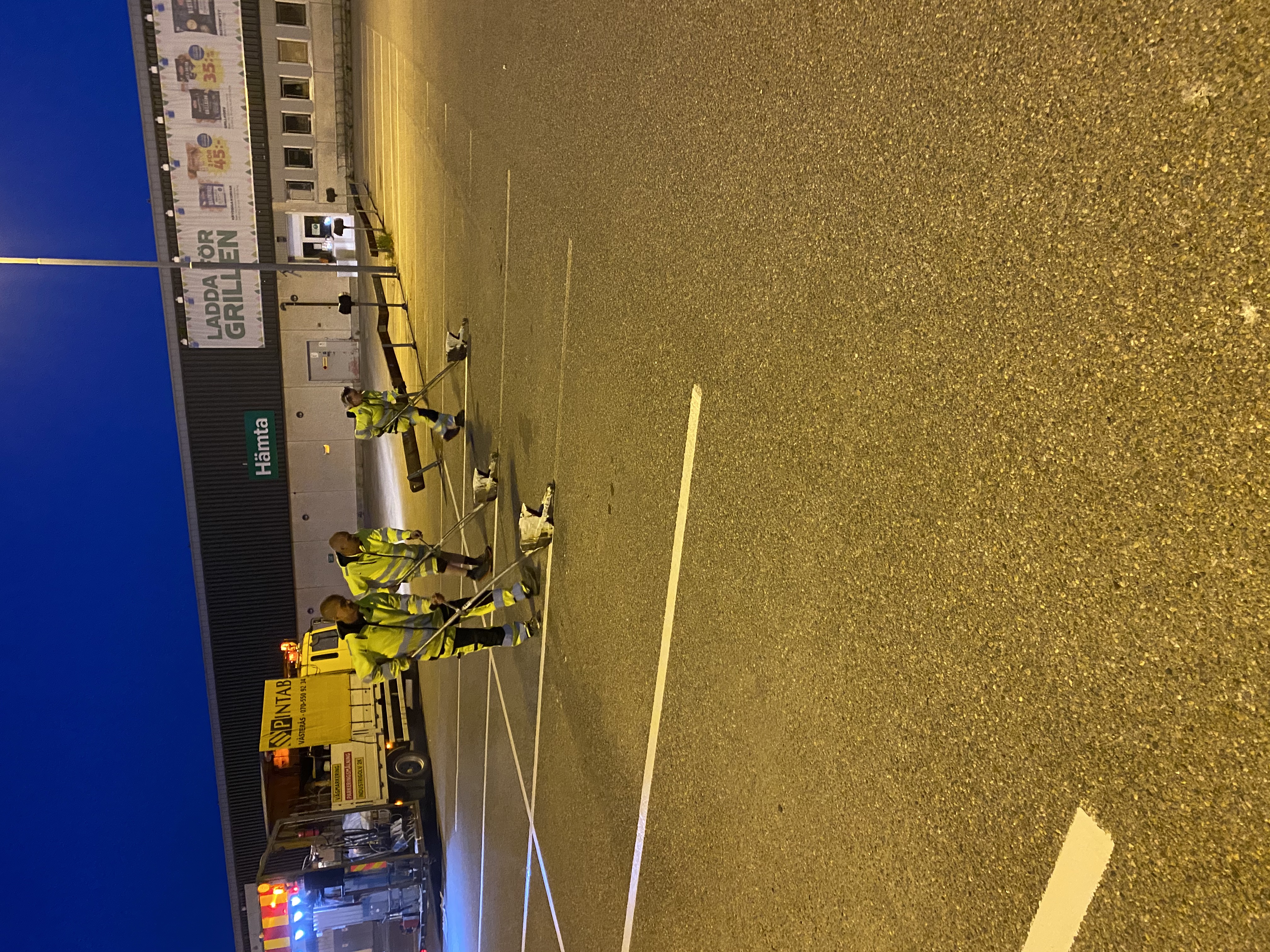 Vi utför tvär- och längsgående vägmarkering med termoplastisk vägmarkeringsmassa. Termoplastmassan hettas upp till 200 grader och läggs ut med handskopor eller extruderbil. Linjerna läggs med tjocklek på ca: 3 mm. Termoplasten innehåller 20% glaspärlor för att ge reflektans. Vi målar vägar, parkeringar gång- och cykelbanor mm.
