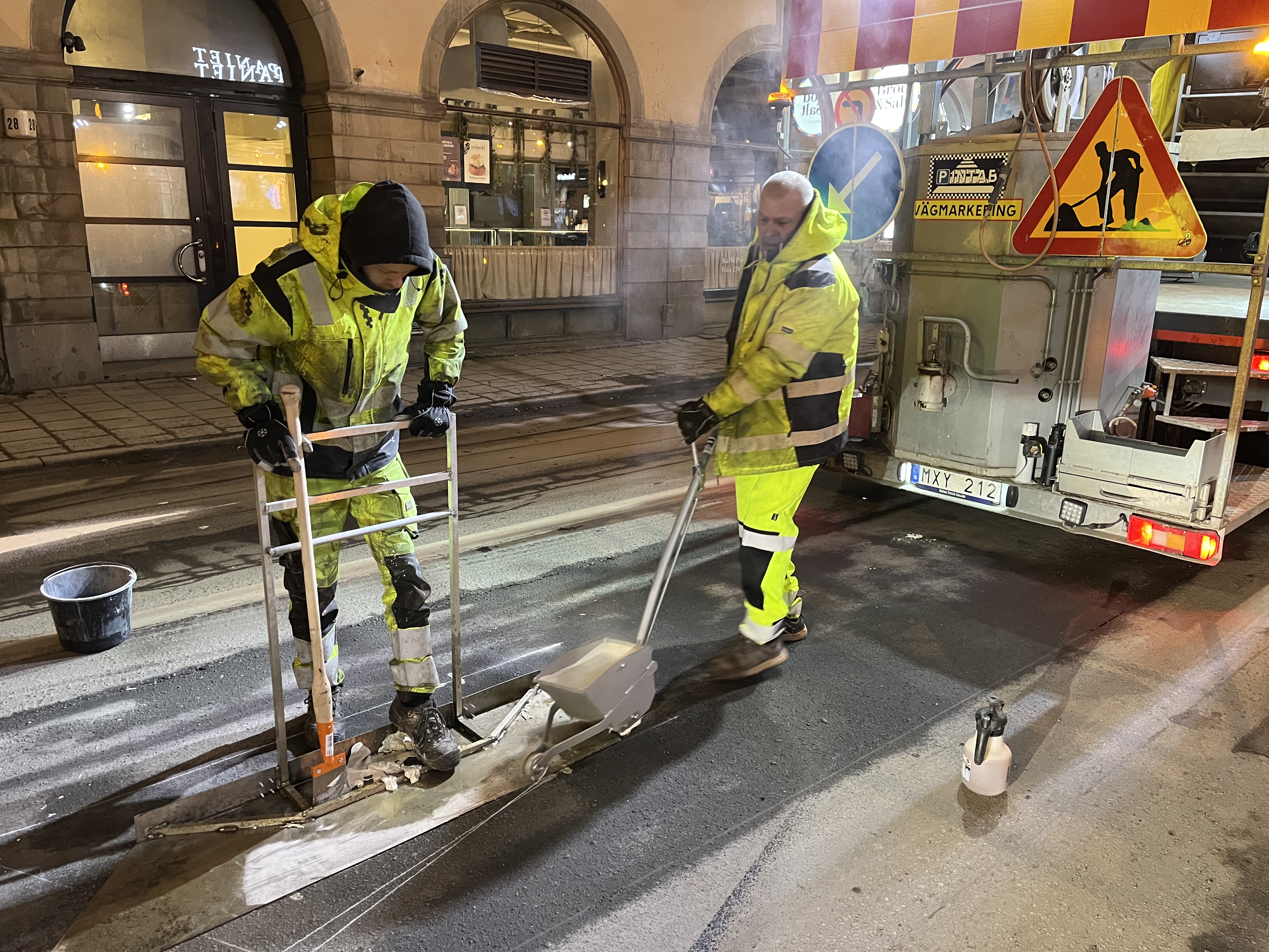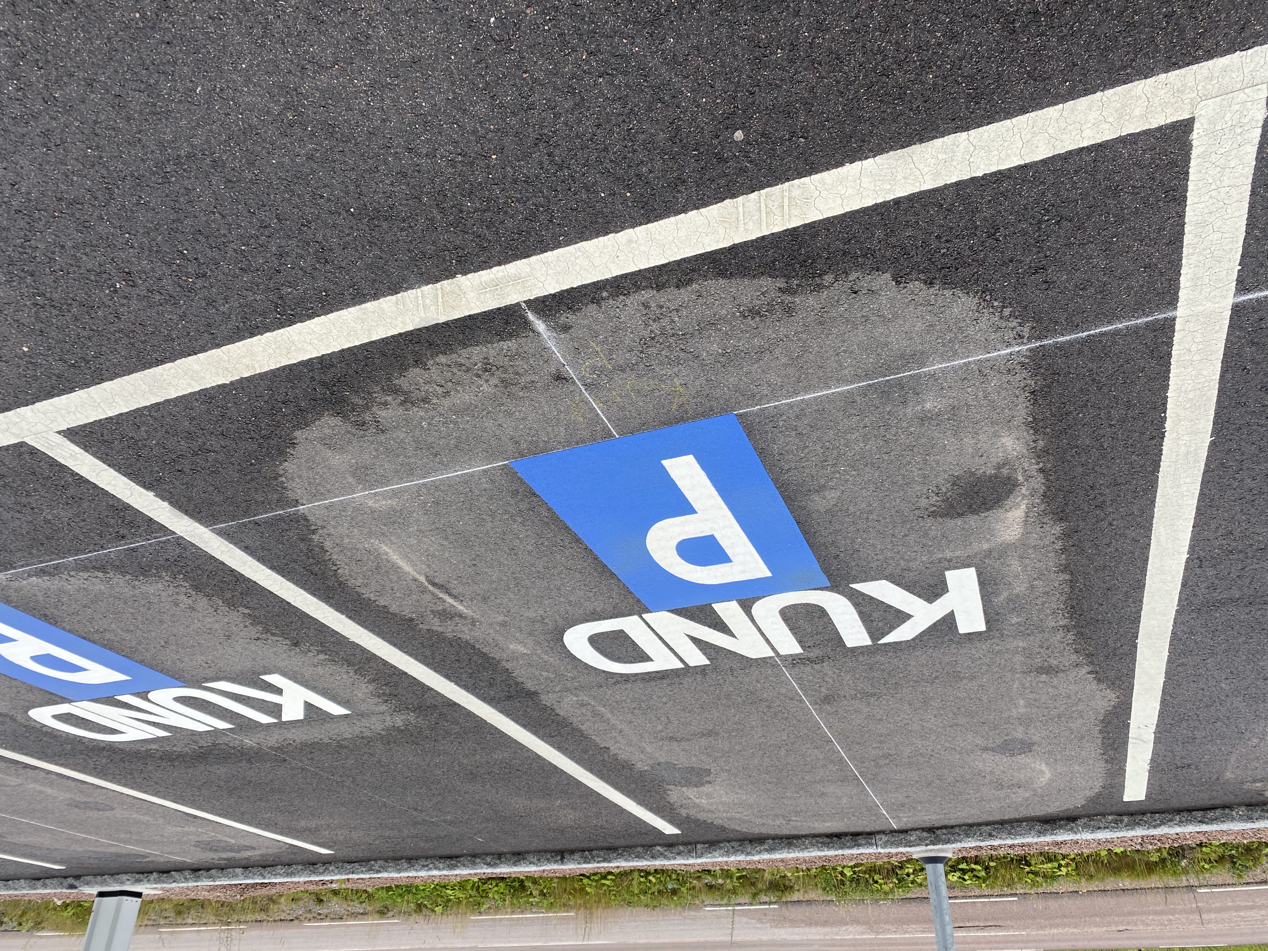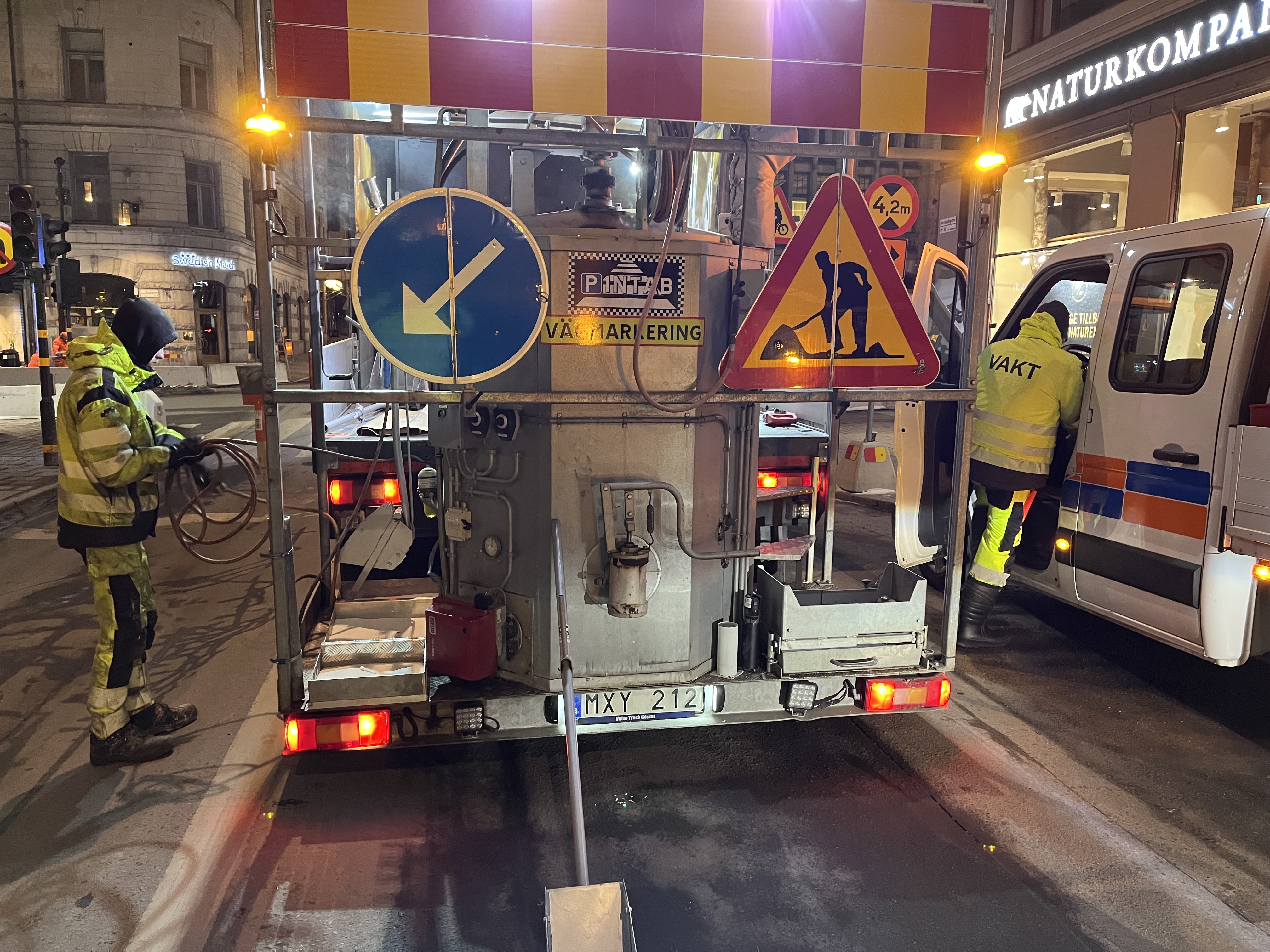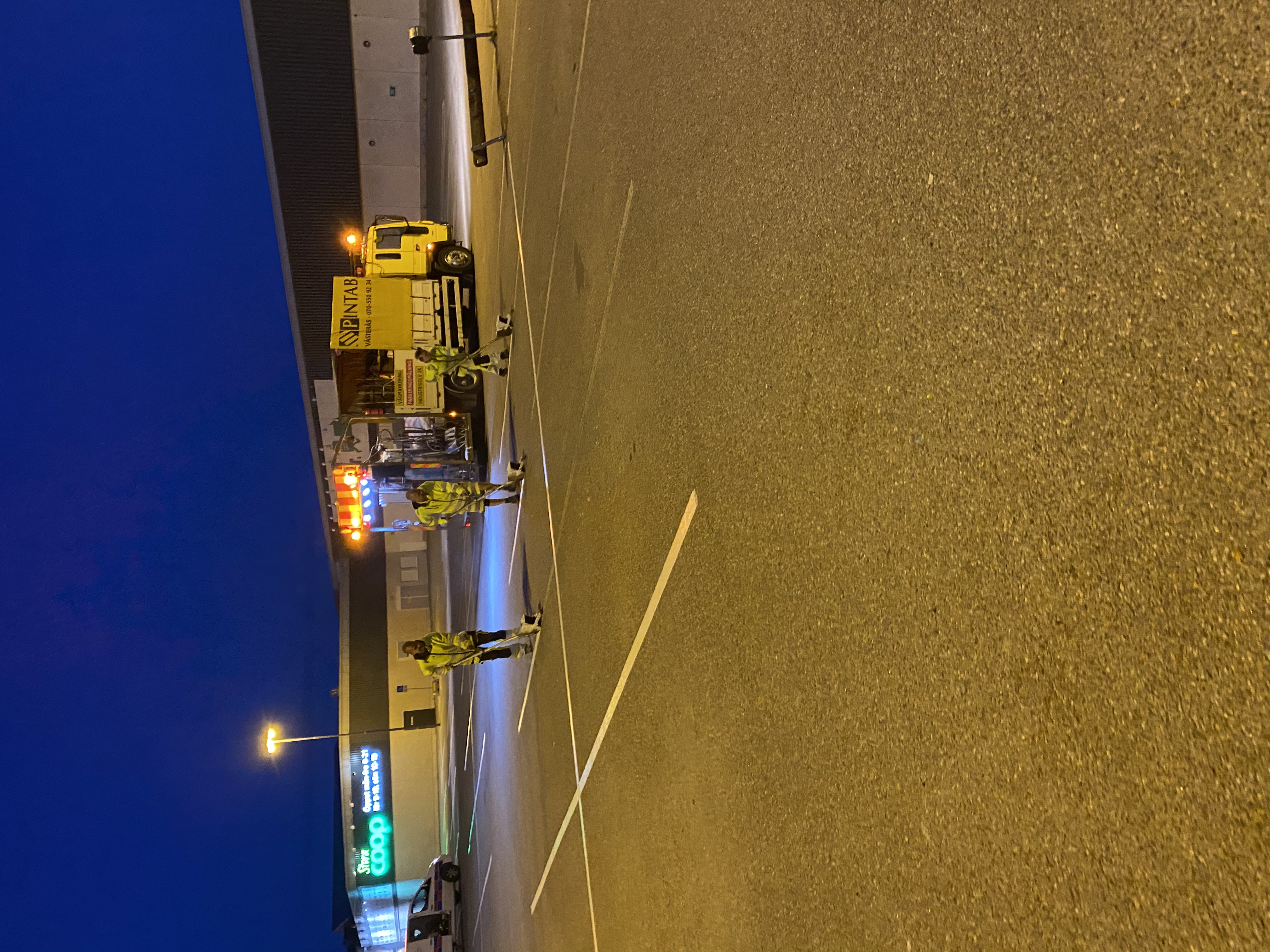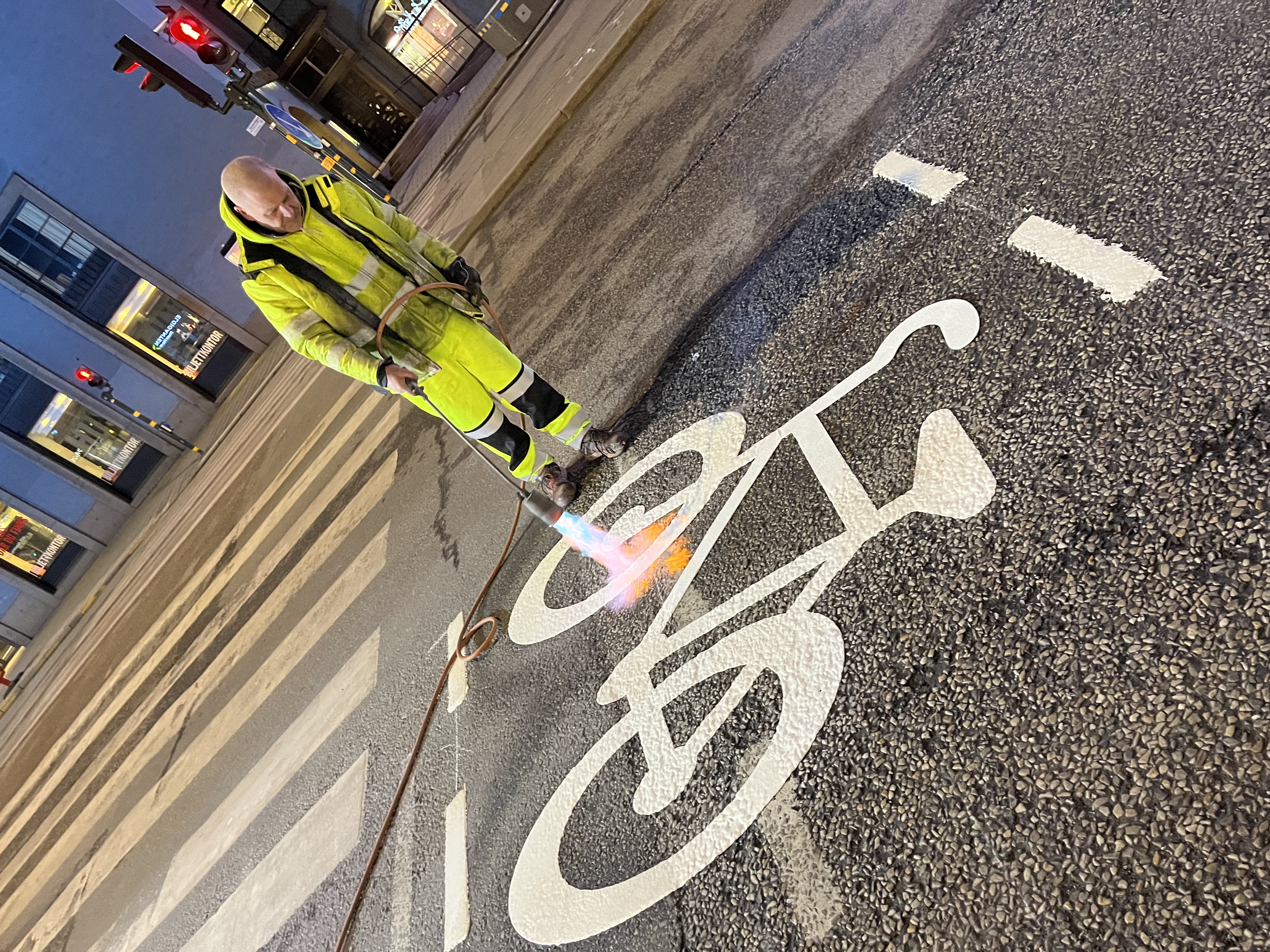 Vi utför tvär- och längsgående vägmarkering med termoplastisk vägmarkeringsmassa. Termoplastmassan hettas upp till 200 grader och läggs ut med handskopor eller extruderbil. Linjerna läggs med tjocklek på ca: 3 mm. Termoplasten innehåller 20% glaspärlor för att ge reflektans. Vi målar vägar, parkeringar gång- och cykelbanor mm.