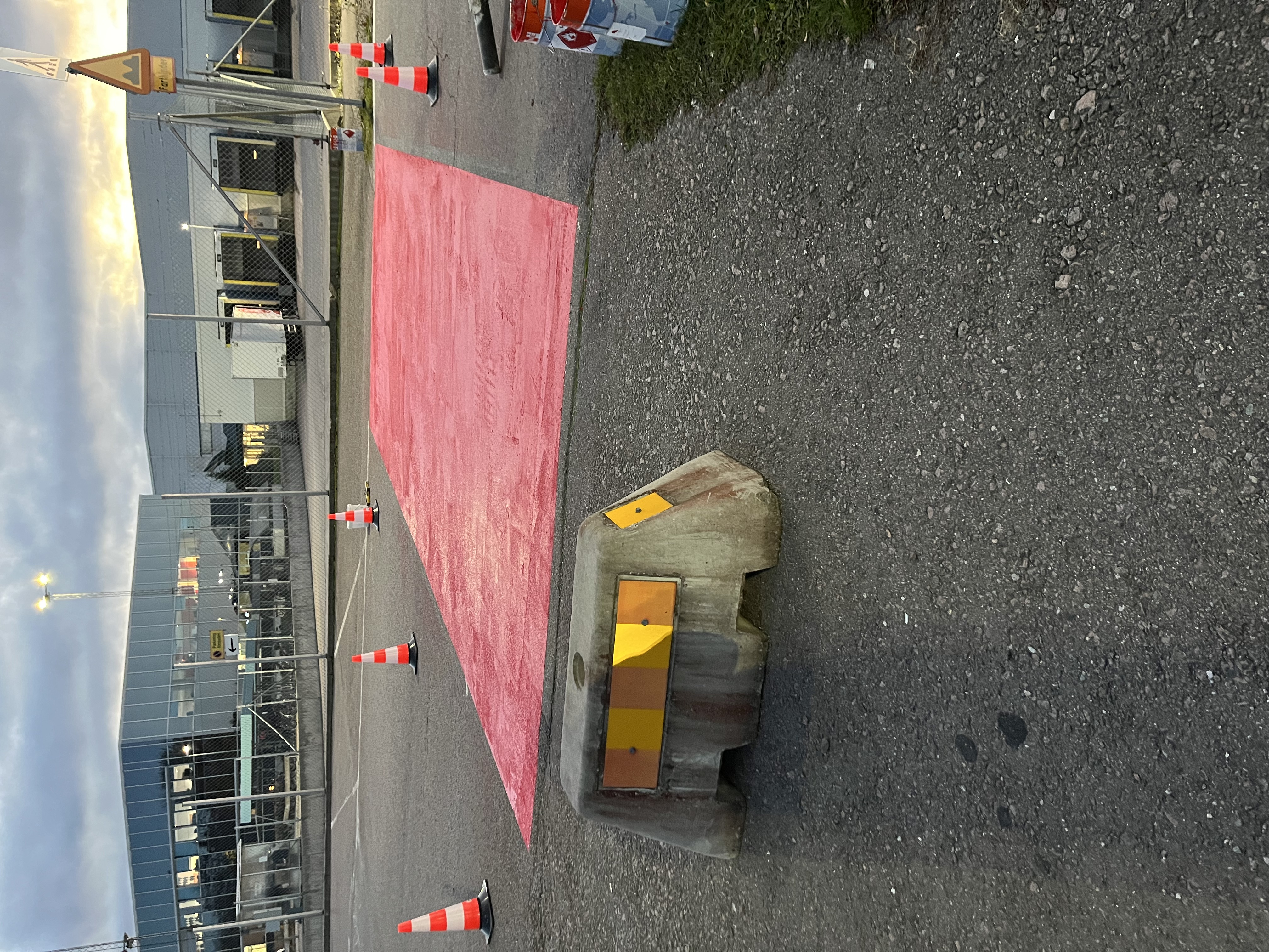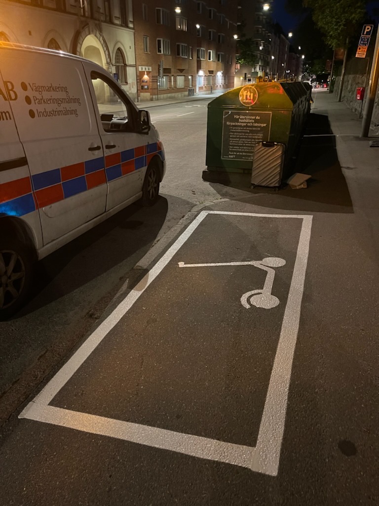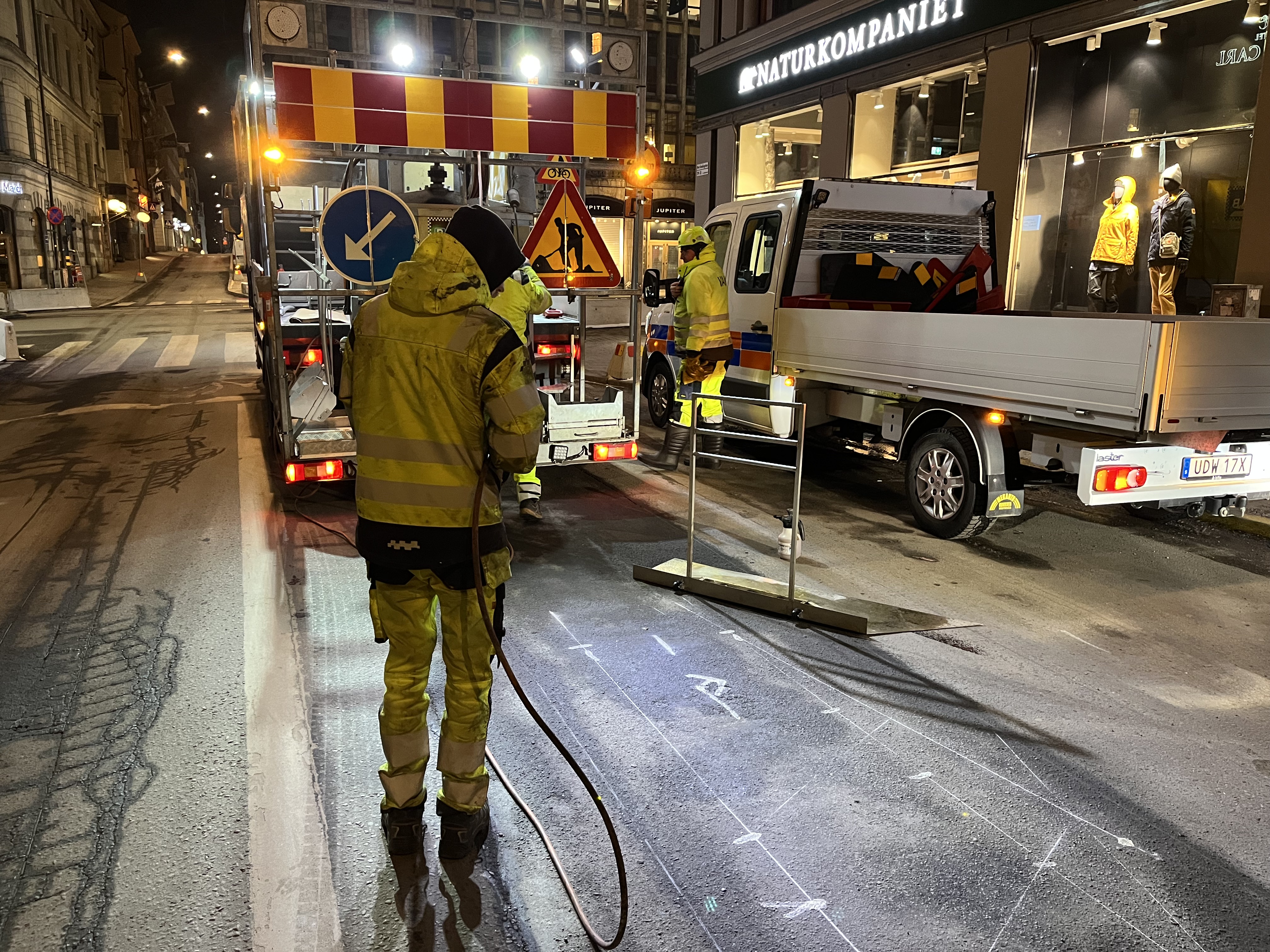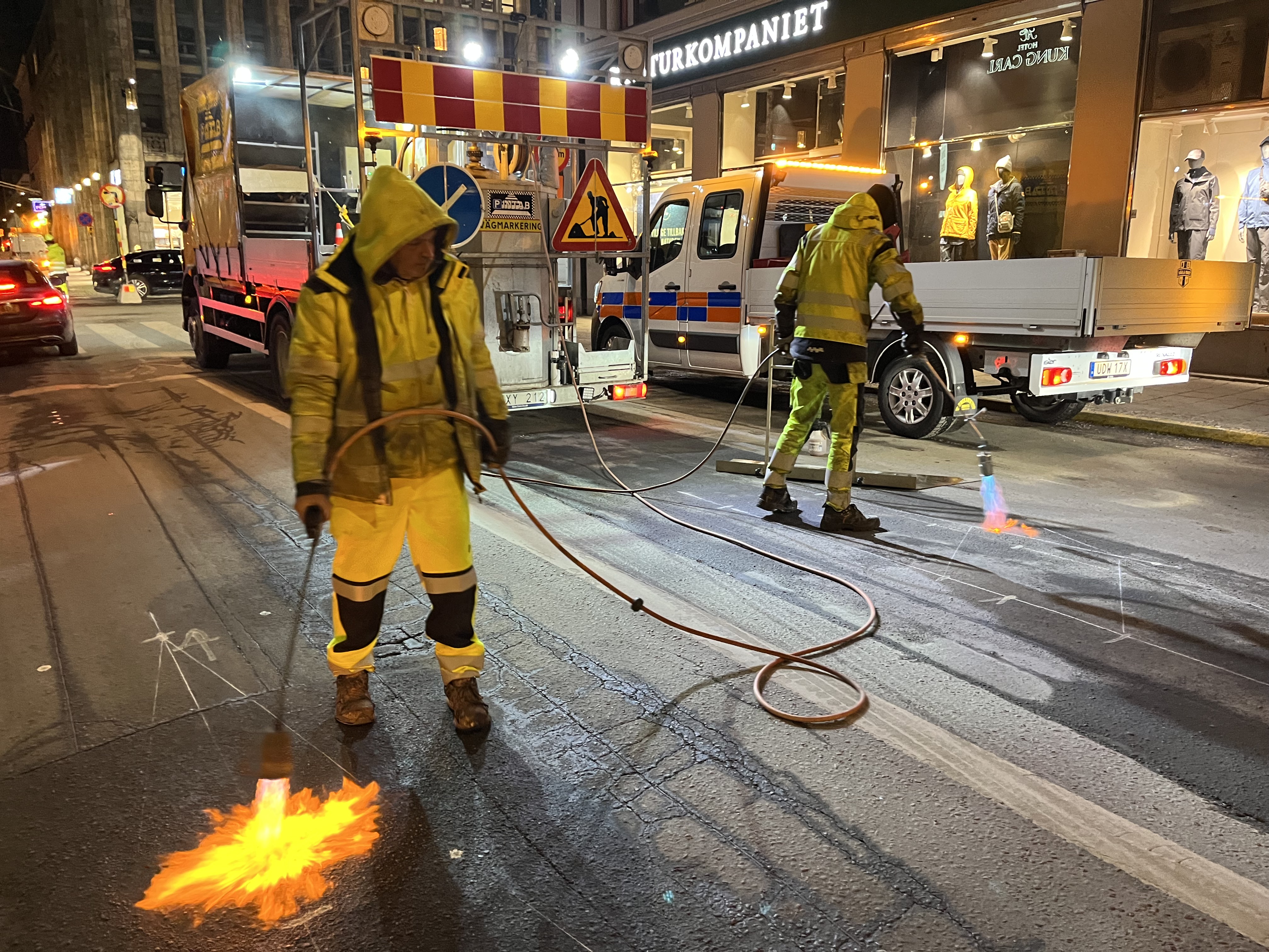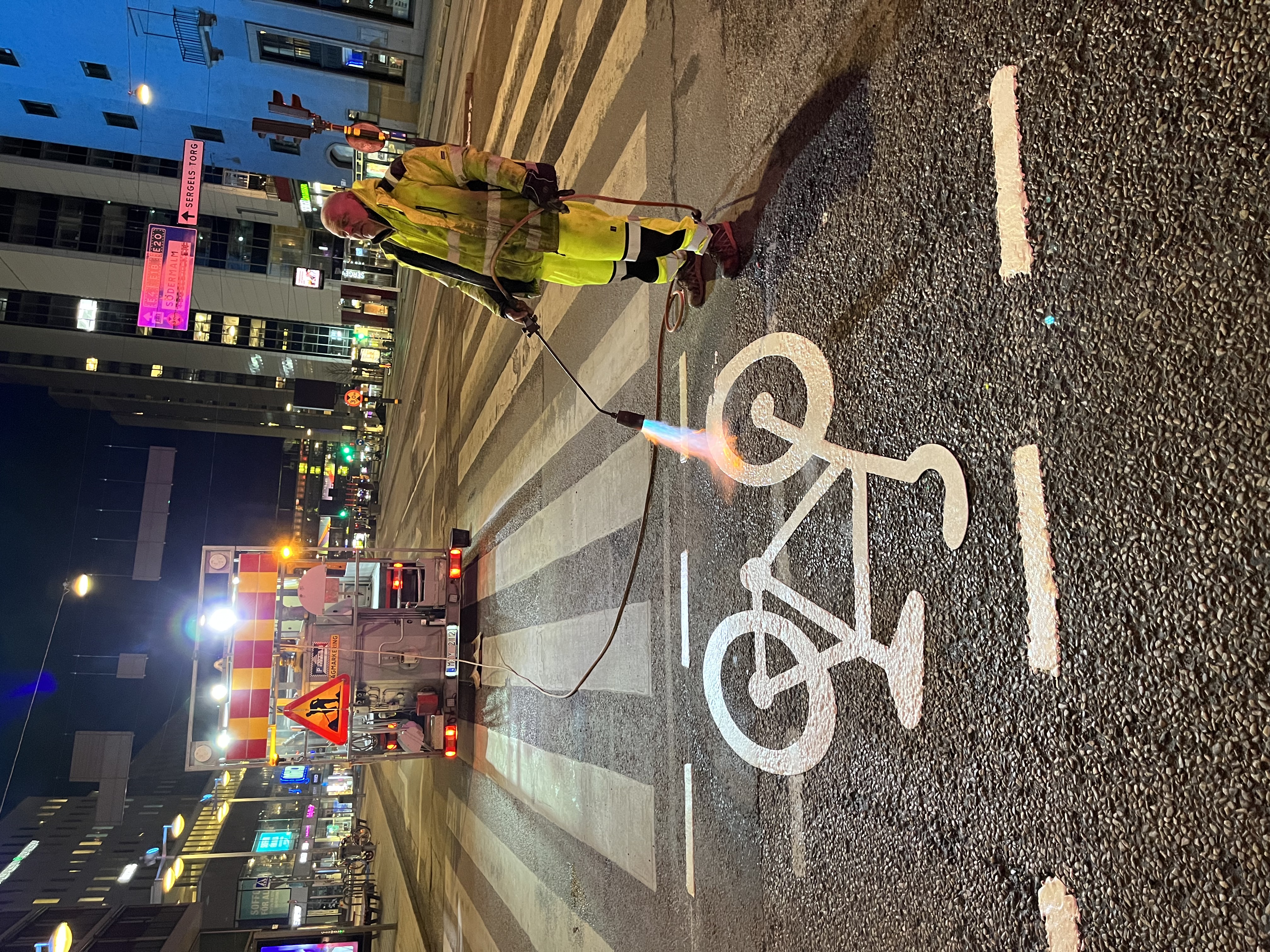 Vi utför tvär- och längsgående vägmarkering med termoplastisk vägmarkeringsmassa. Termoplastmassan hettas upp till 200 grader och läggs ut med handskopor eller extruderbil. Linjerna läggs med tjocklek på ca: 3 mm. Termoplasten innehåller 20% glaspärlor för att ge reflektans. Vi målar vägar, parkeringar gång- och cykelbanor mm.