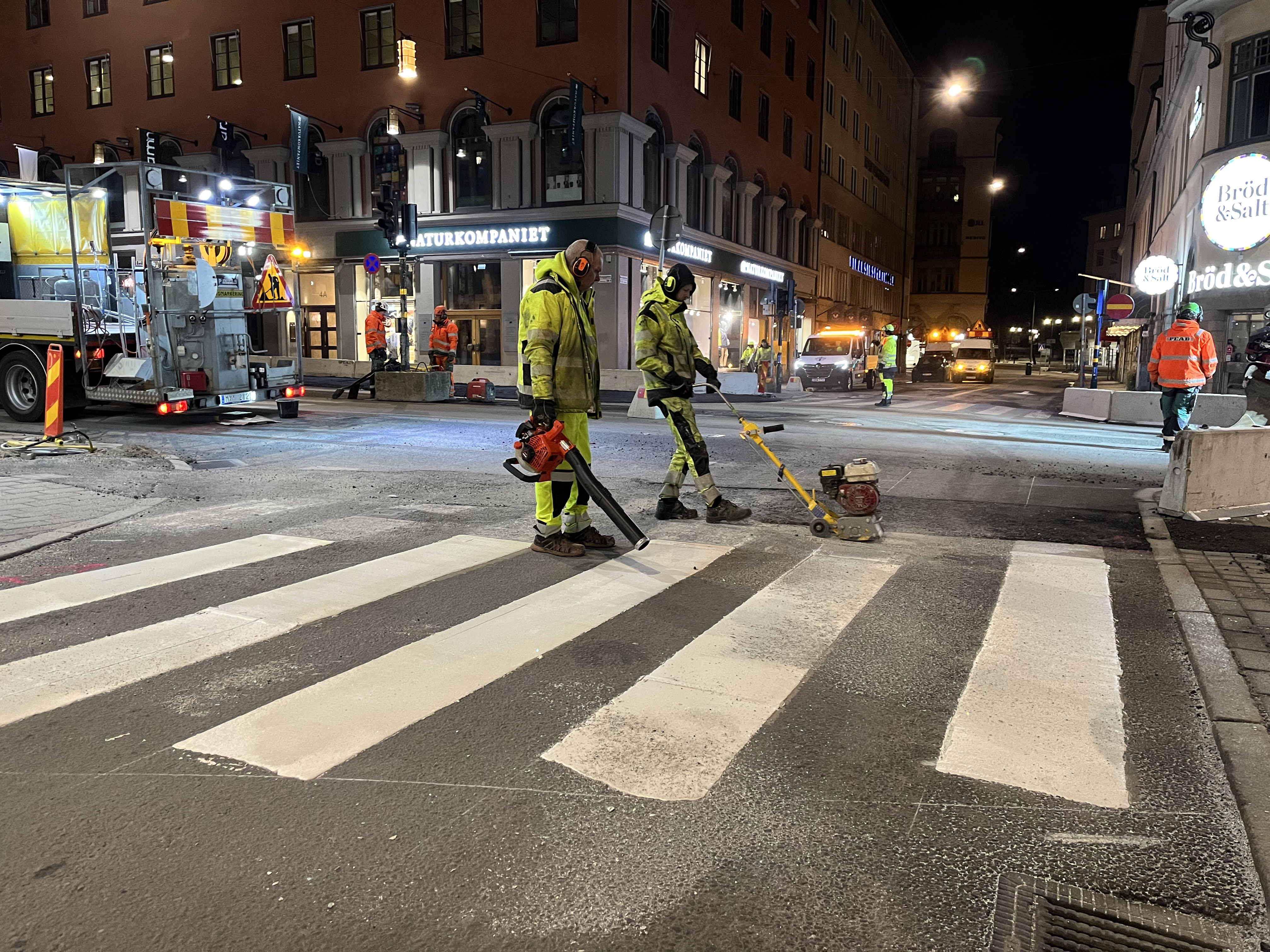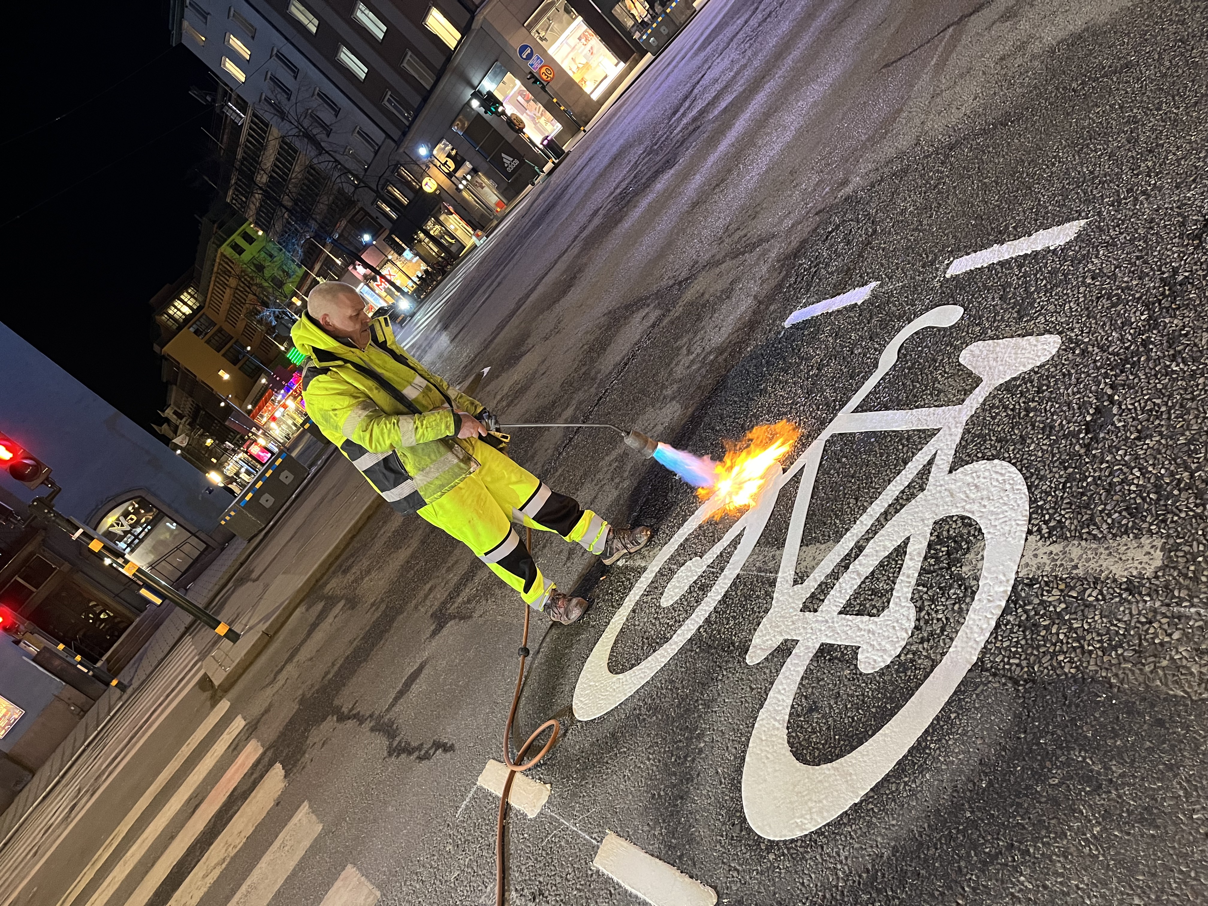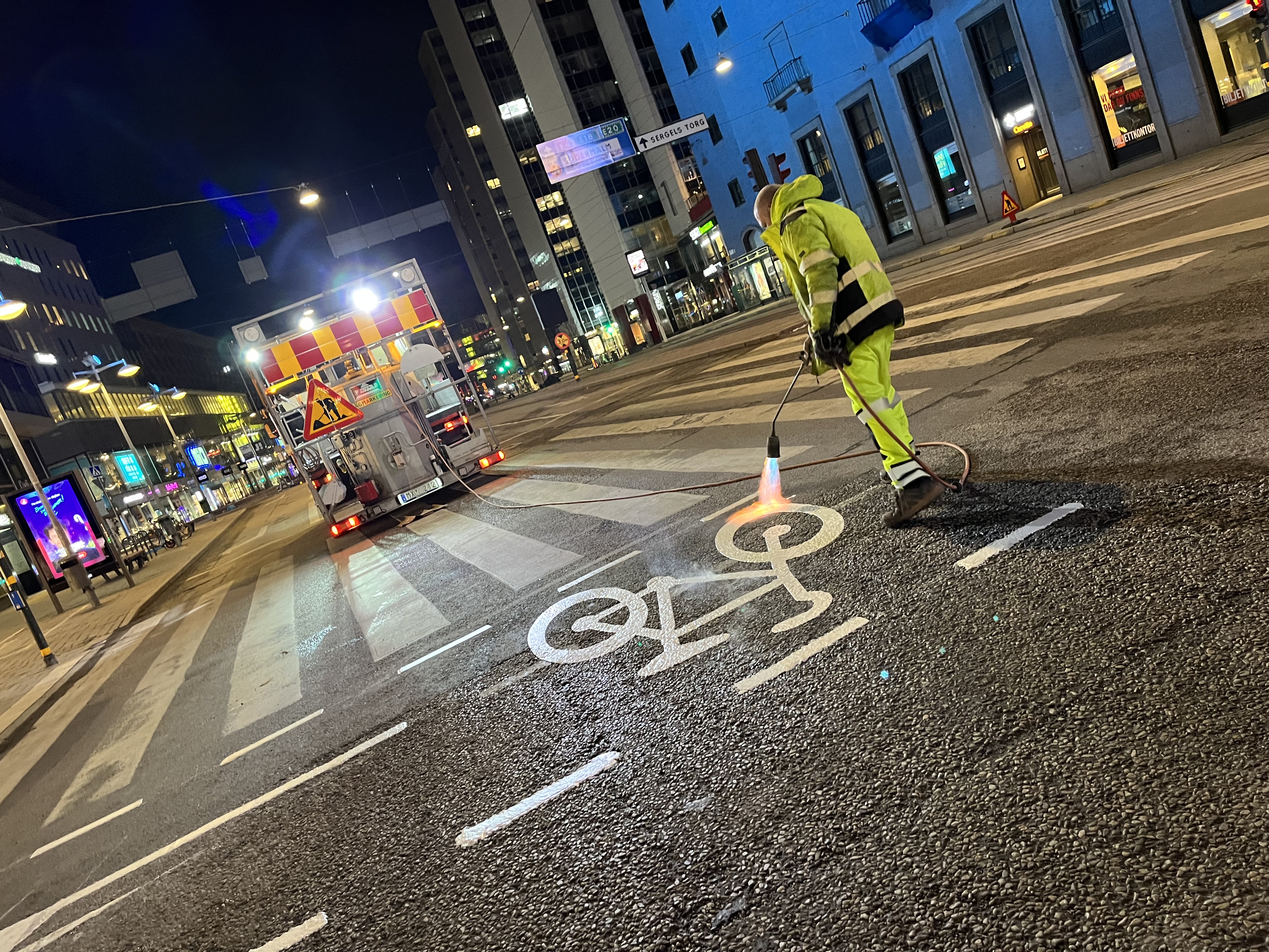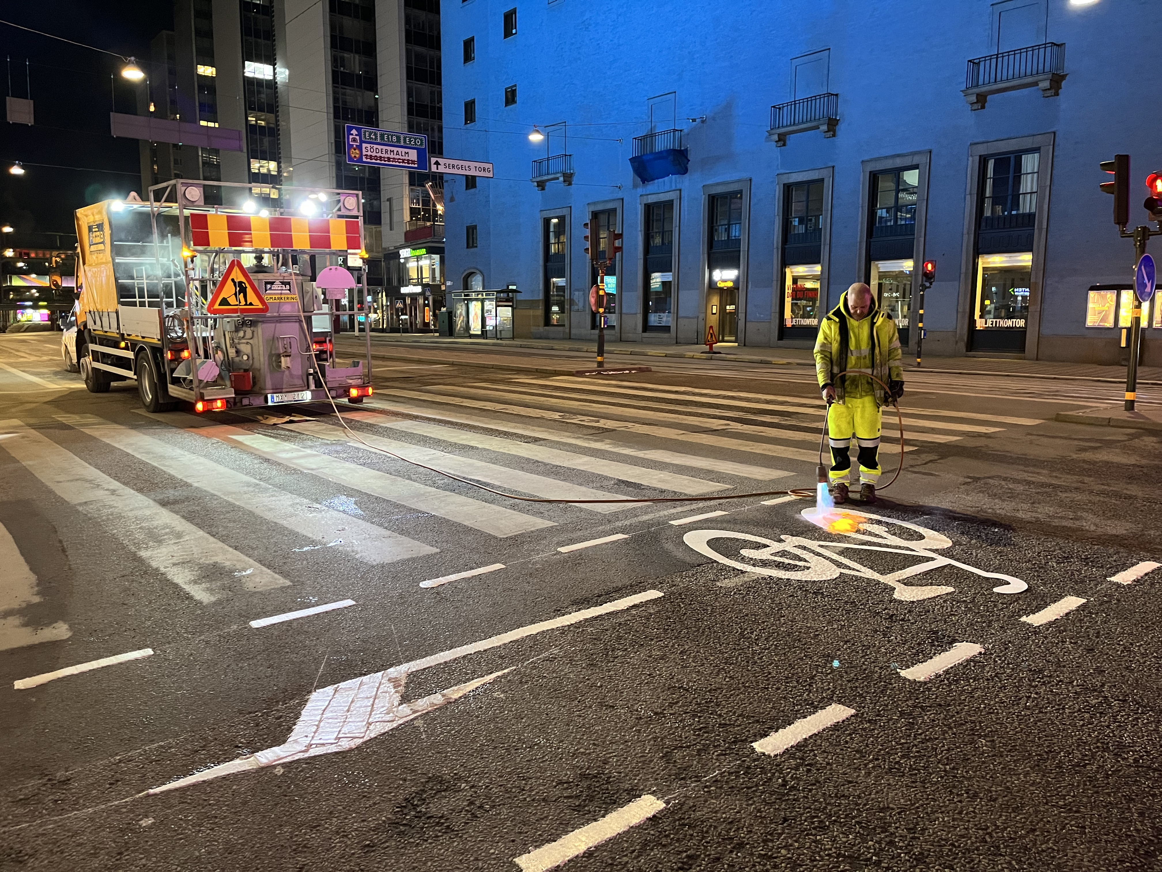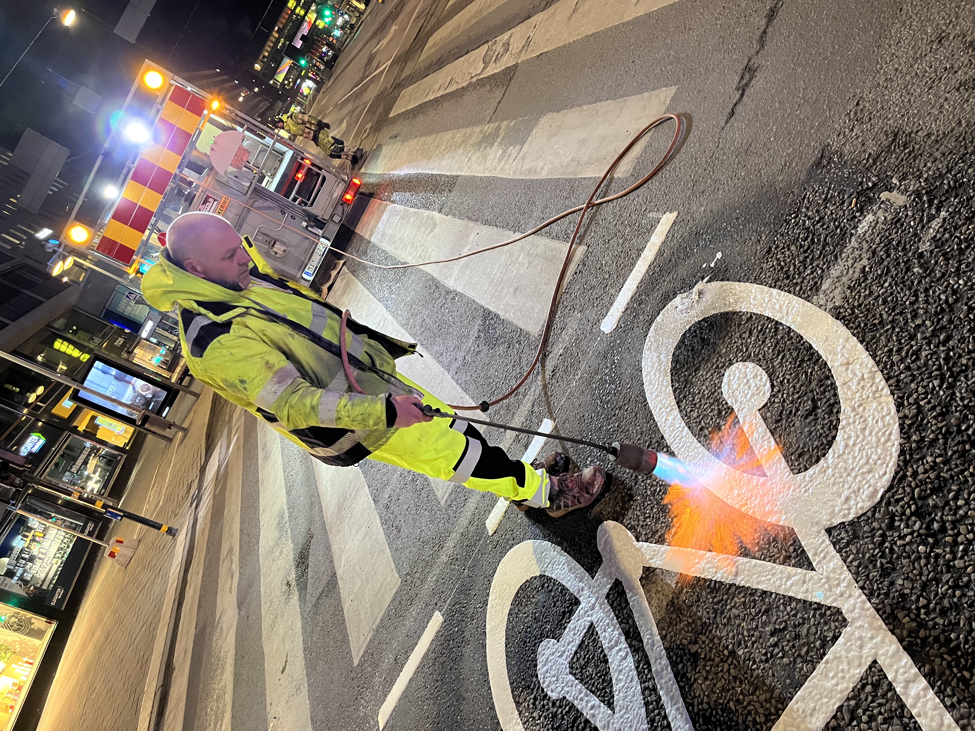 Vi utför tvär- och längsgående vägmarkering med termoplastisk vägmarkeringsmassa. Termoplastmassan hettas upp till 200 grader och läggs ut med handskopor eller extruderbil. Linjerna läggs med tjocklek på ca: 3 mm. Termoplasten innehåller 20% glaspärlor för att ge reflektans. Vi målar vägar, parkeringar gång- och cykelbanor mm.