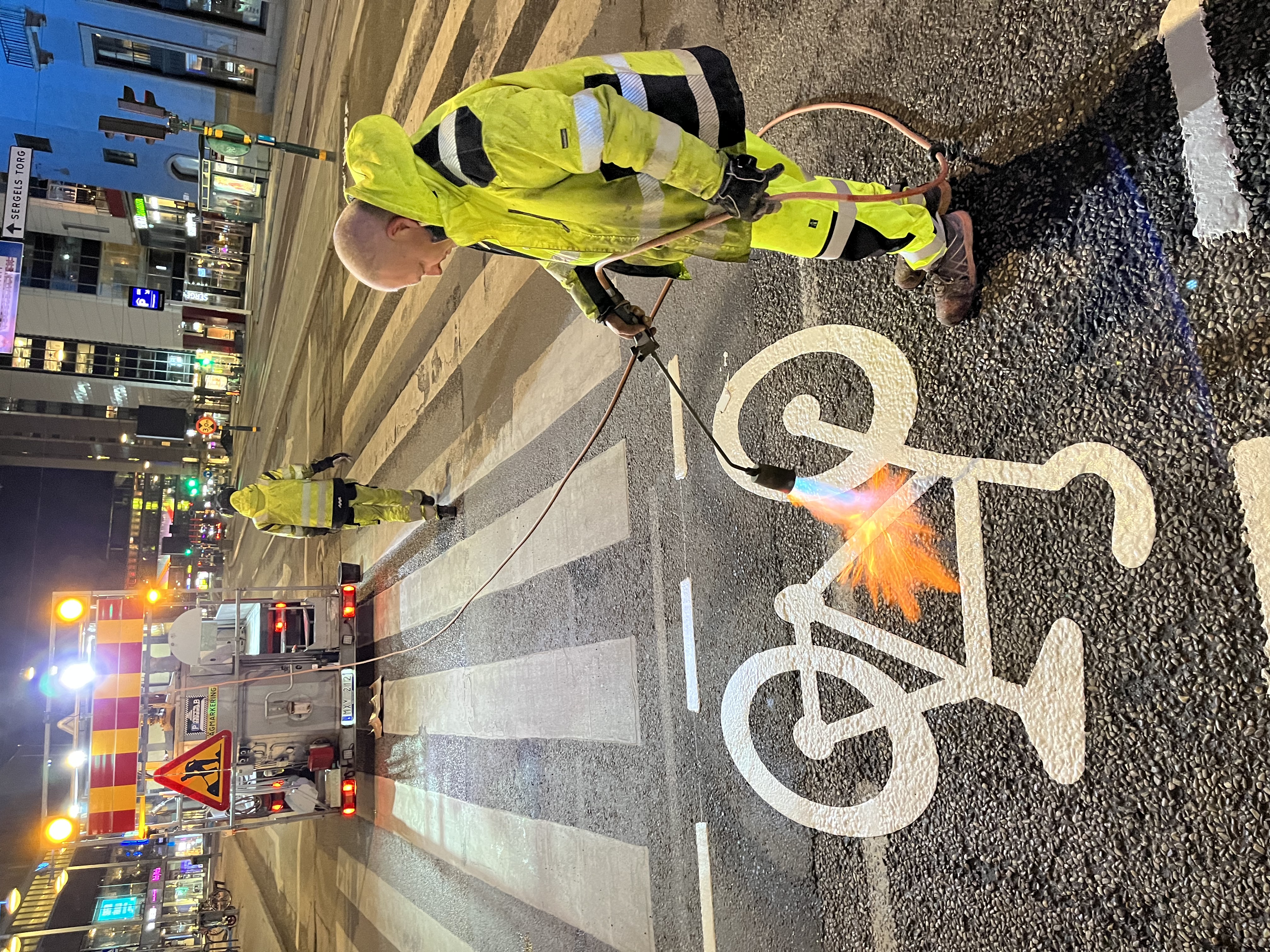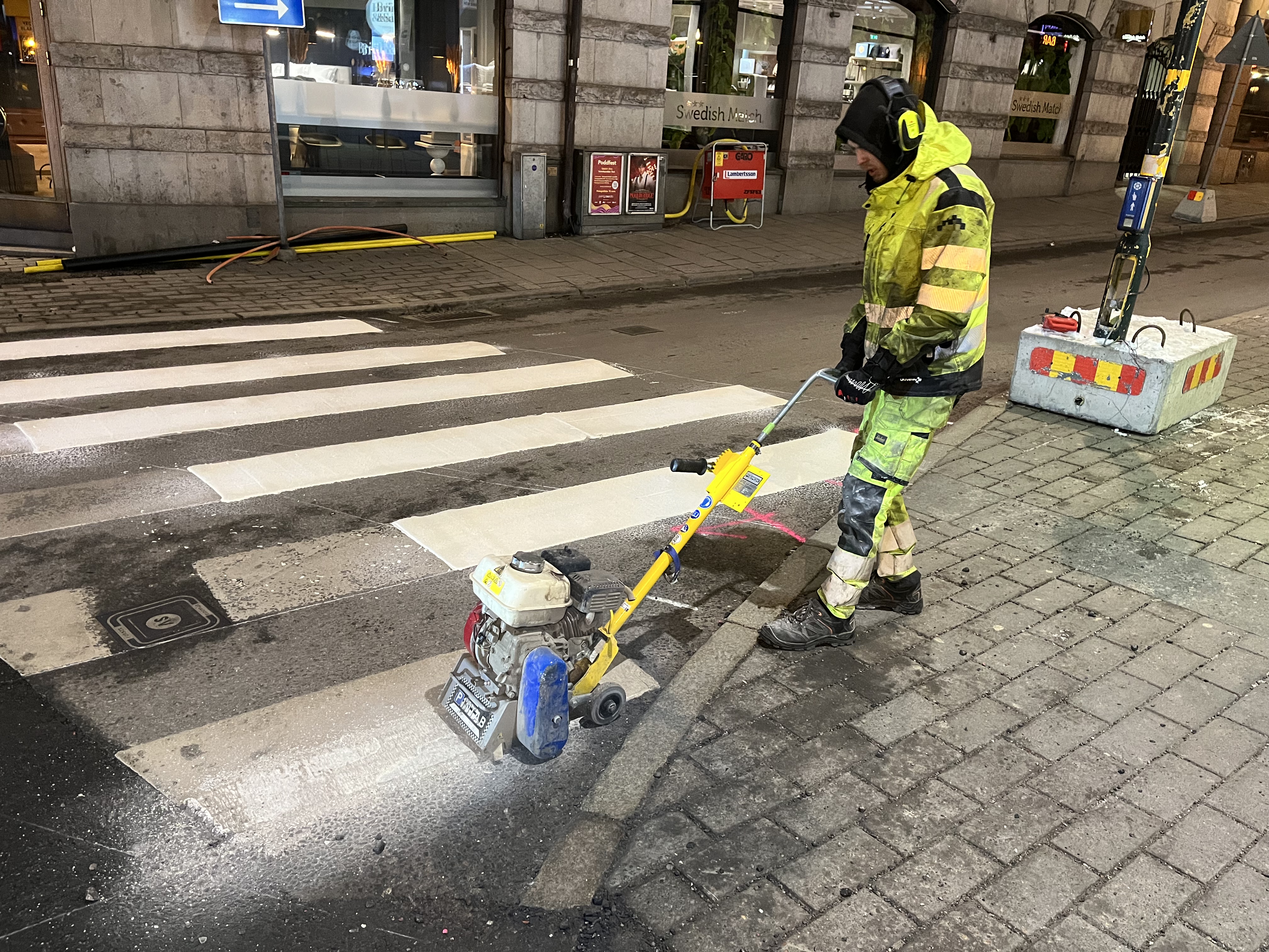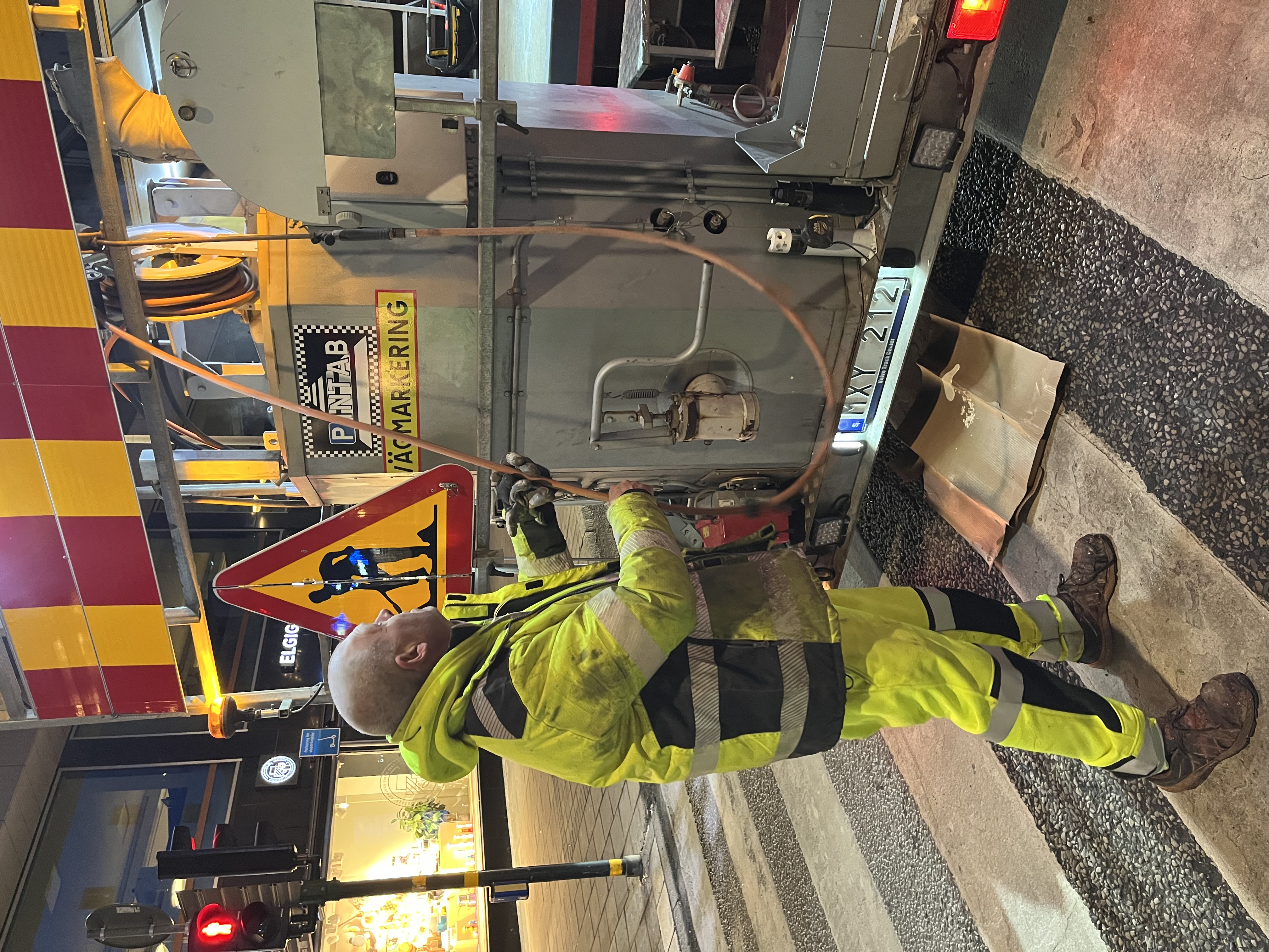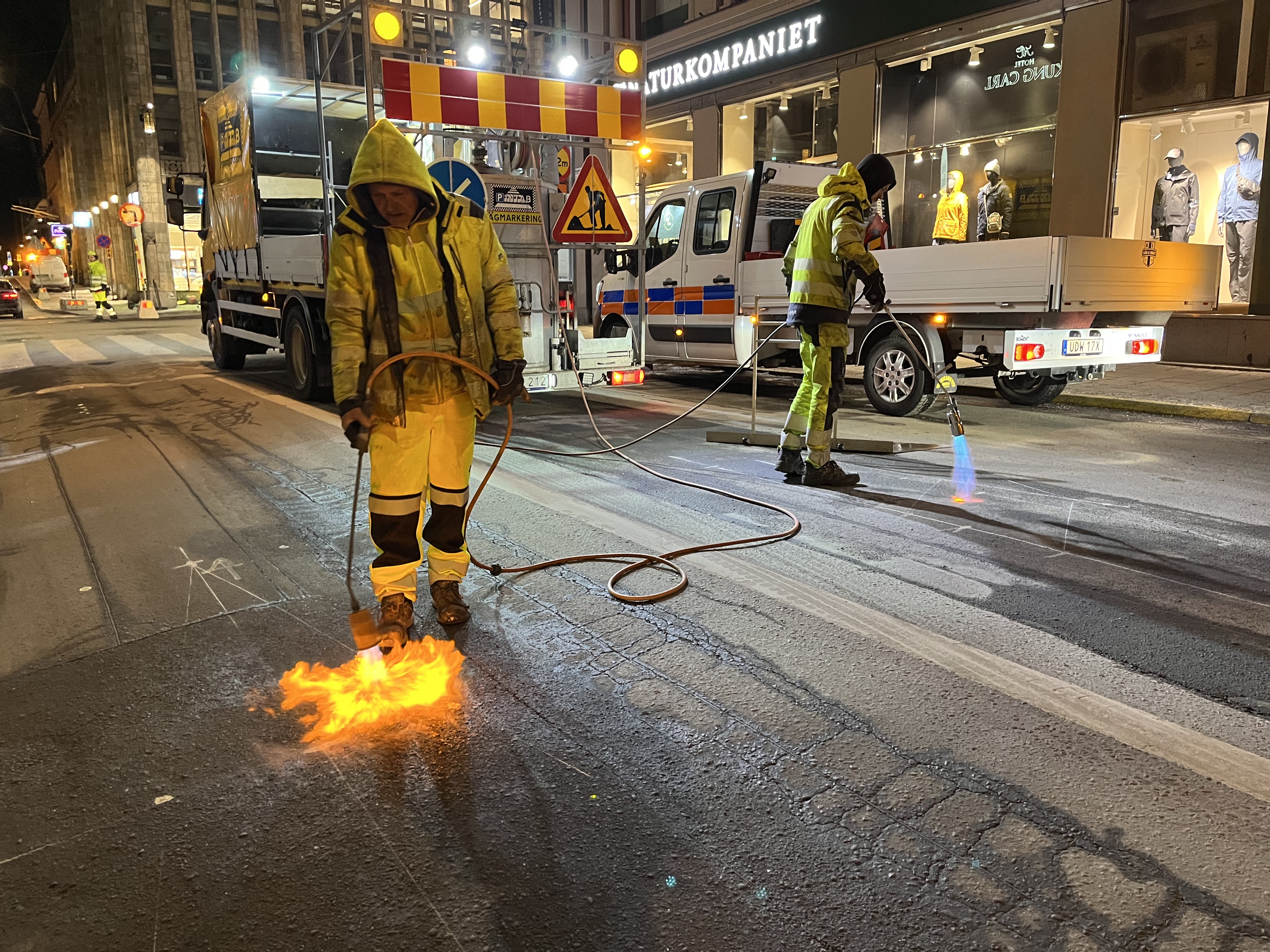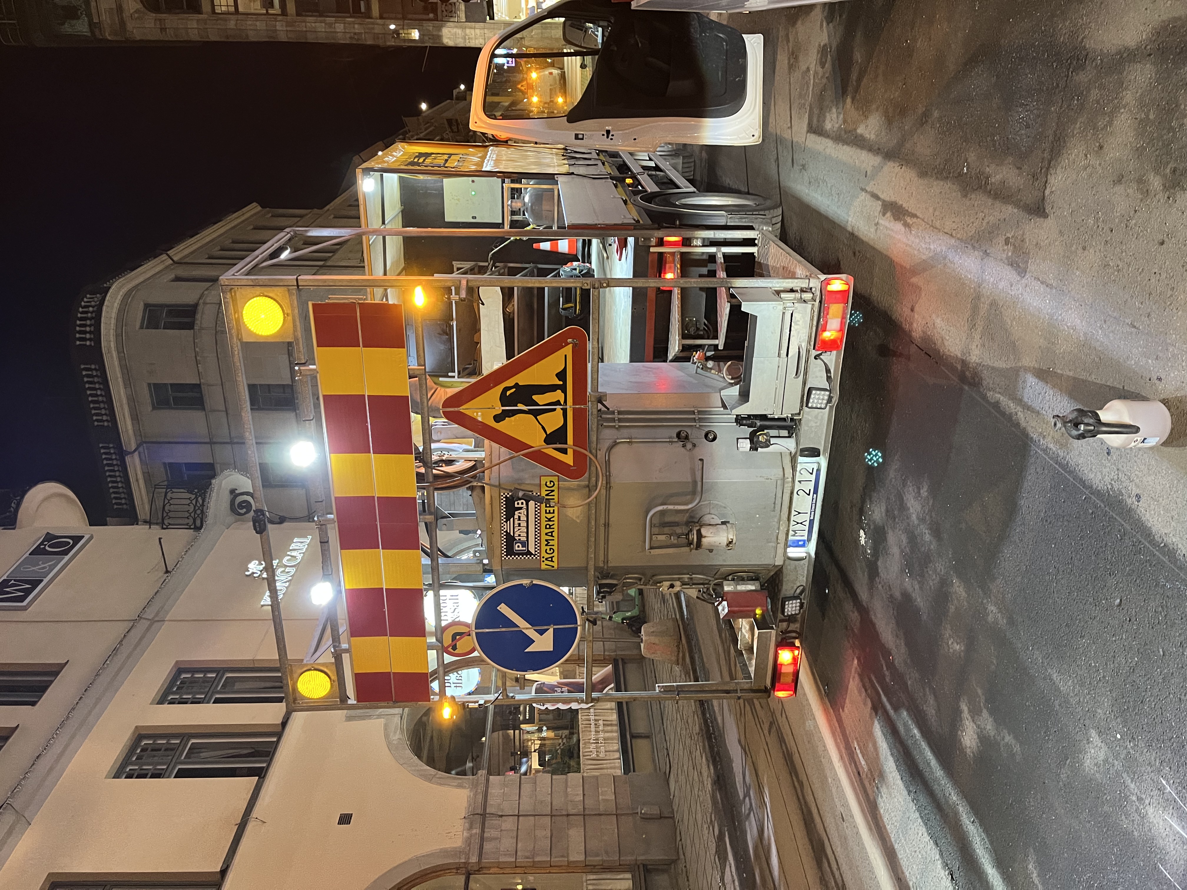 Vi utför tvär- och längsgående vägmarkering med termoplastisk vägmarkeringsmassa. Termoplastmassan hettas upp till 200 grader och läggs ut med handskopor eller extruderbil. Linjerna läggs med tjocklek på ca: 3 mm. Termoplasten innehåller 20% glaspärlor för att ge reflektans. Vi målar vägar, parkeringar gång- och cykelbanor mm.