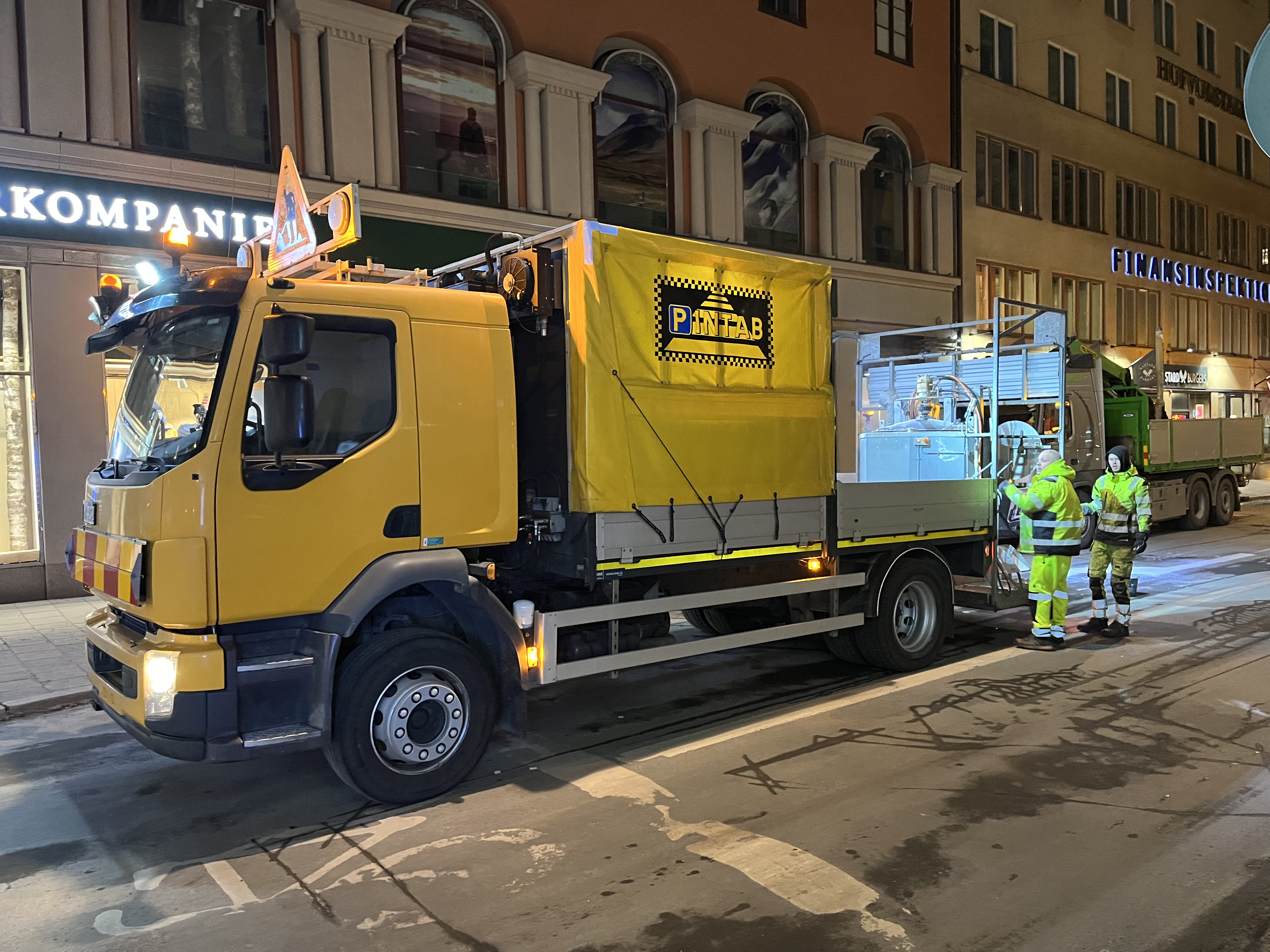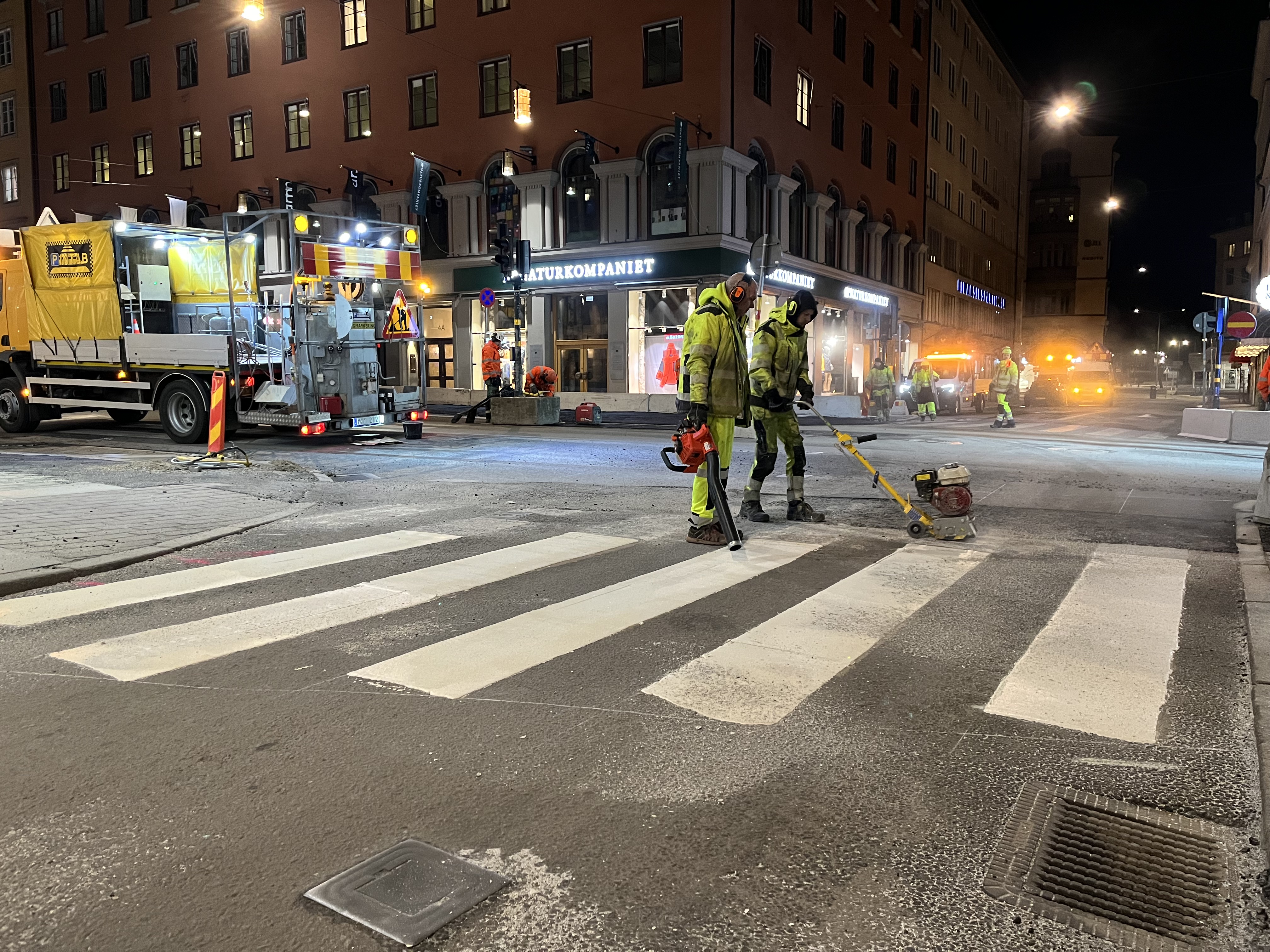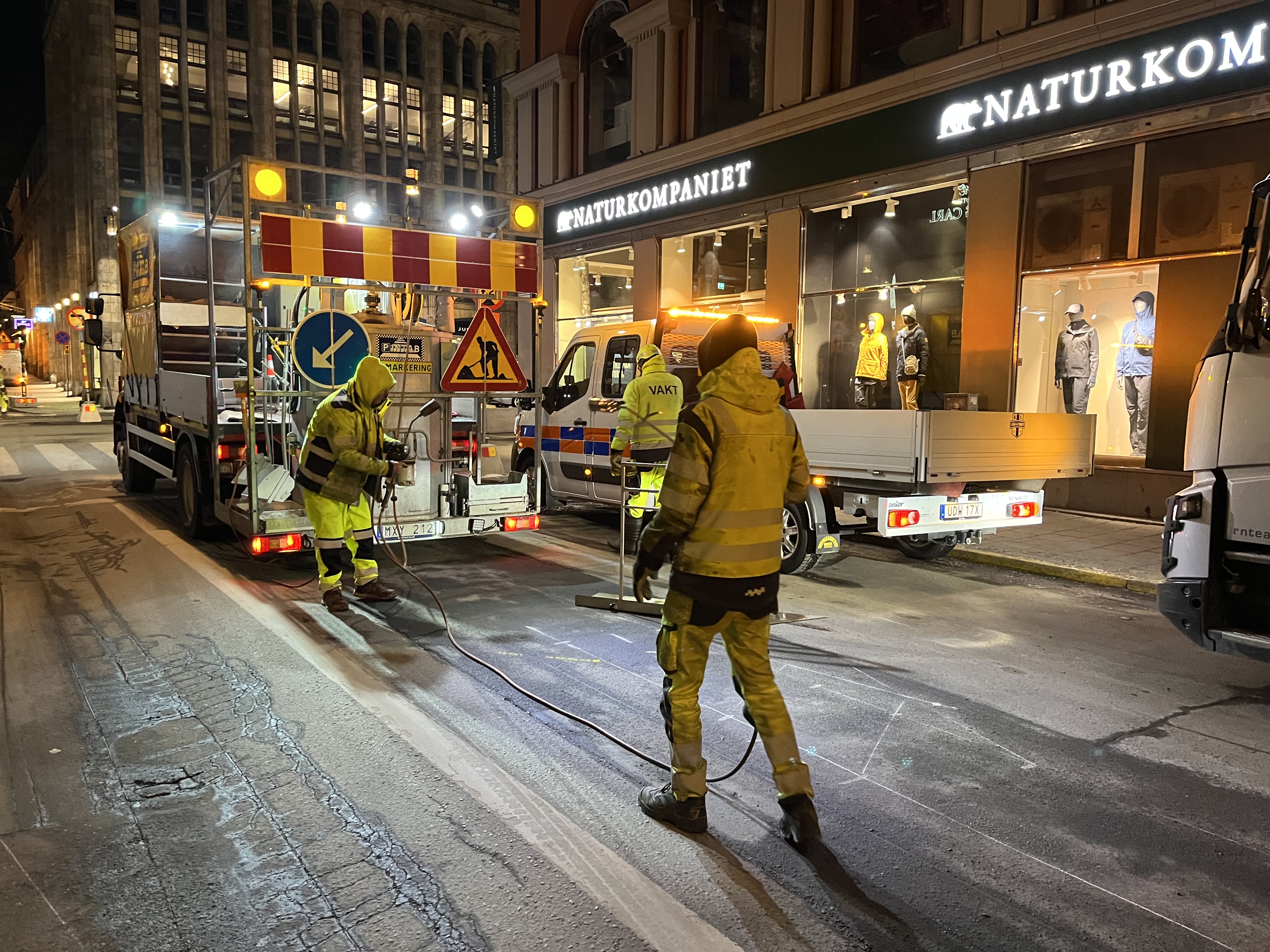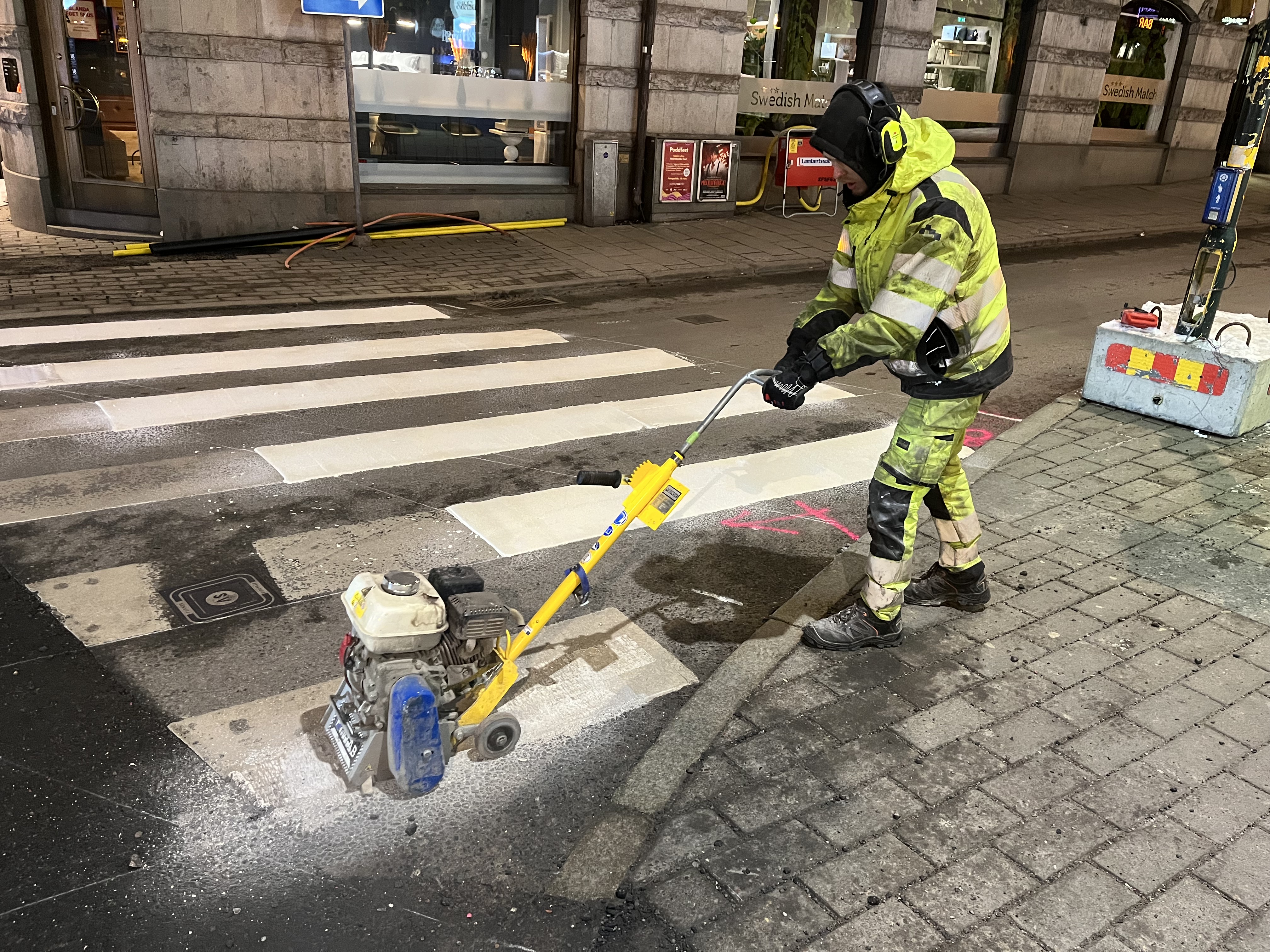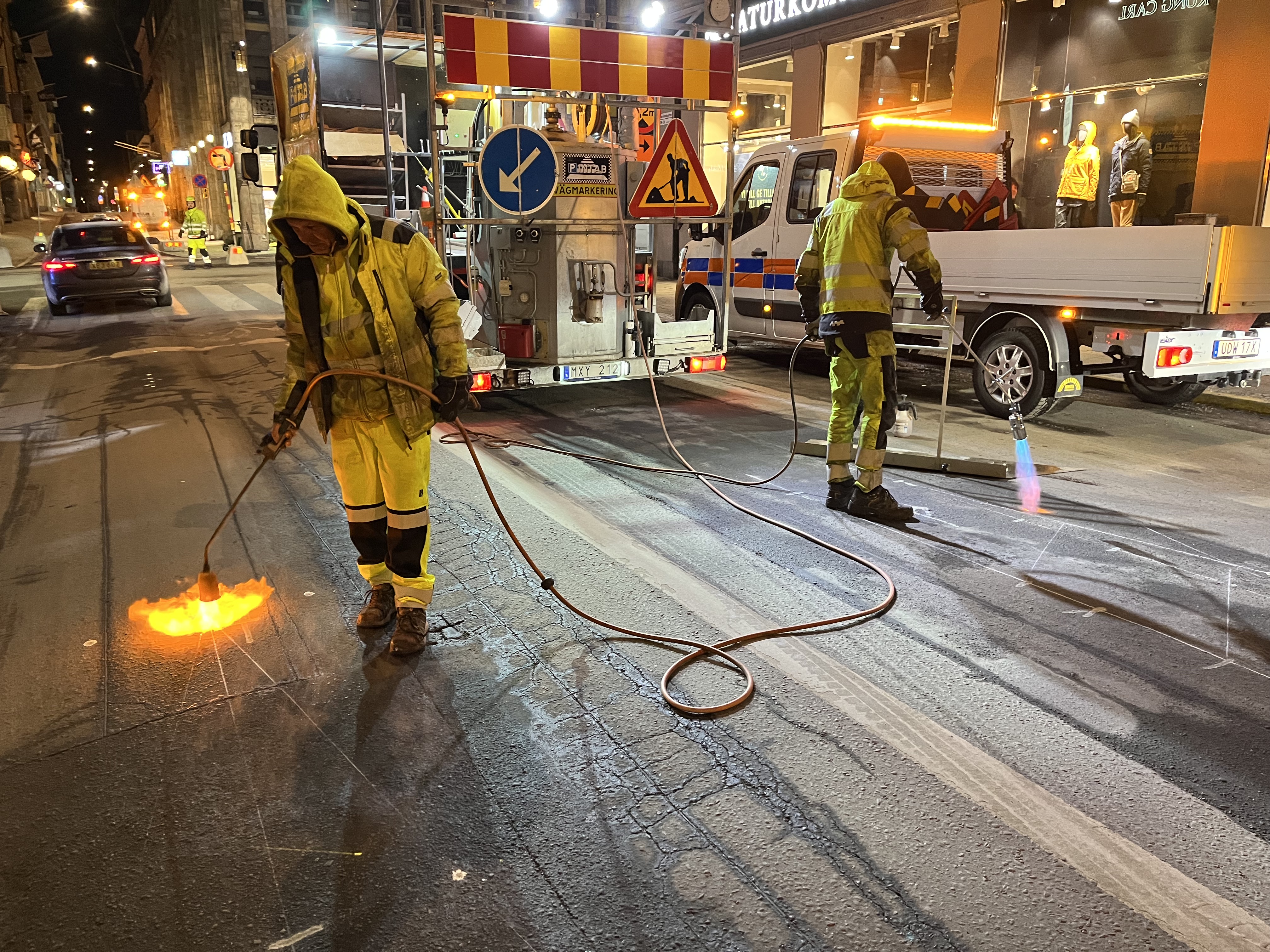 Vi utför tvär- och längsgående vägmarkering med termoplastisk vägmarkeringsmassa. Termoplastmassan hettas upp till 200 grader och läggs ut med handskopor eller extruderbil. Linjerna läggs med tjocklek på ca: 3 mm. Termoplasten innehåller 20% glaspärlor för att ge reflektans. Vi målar vägar, parkeringar gång- och cykelbanor mm.