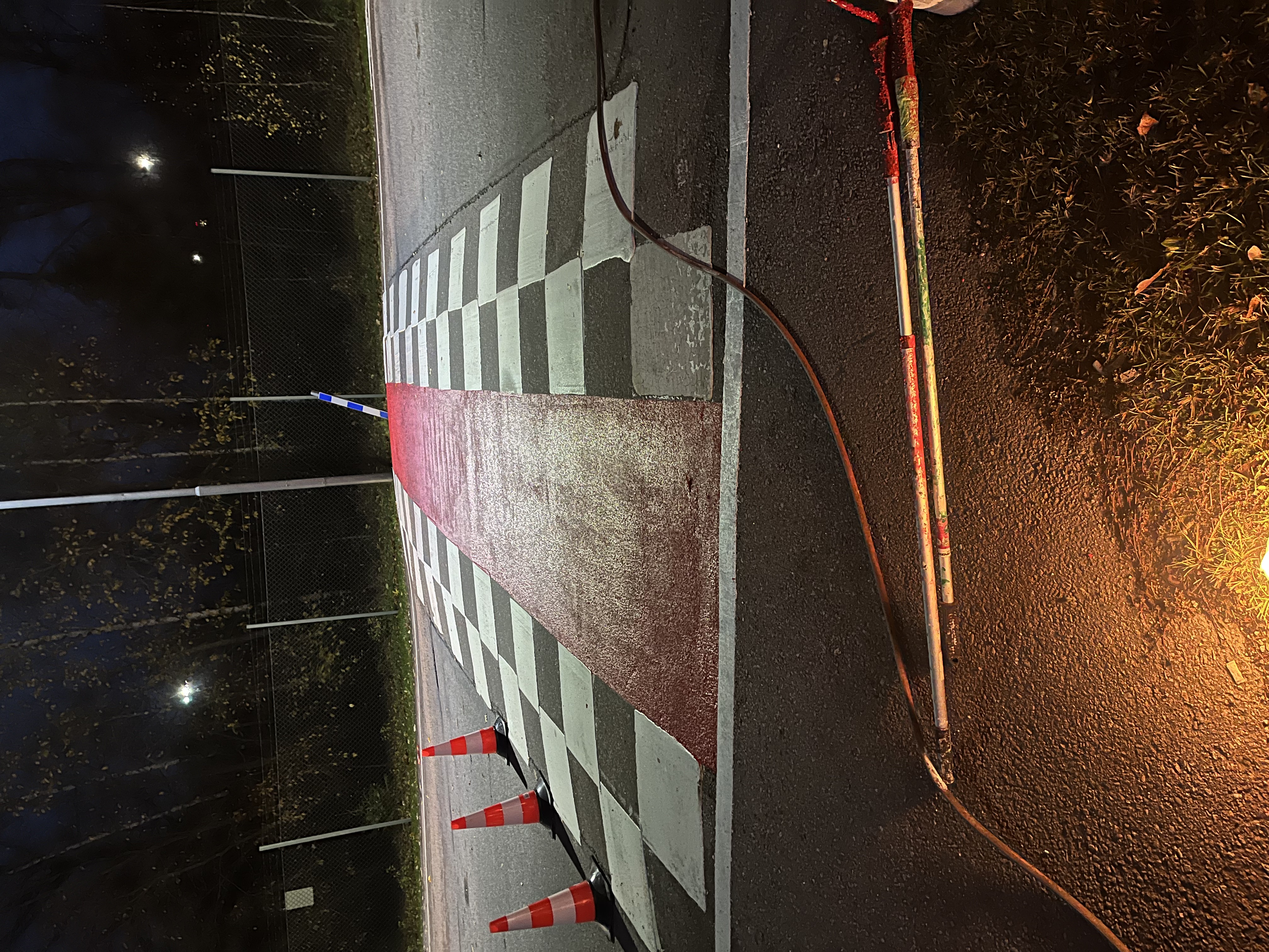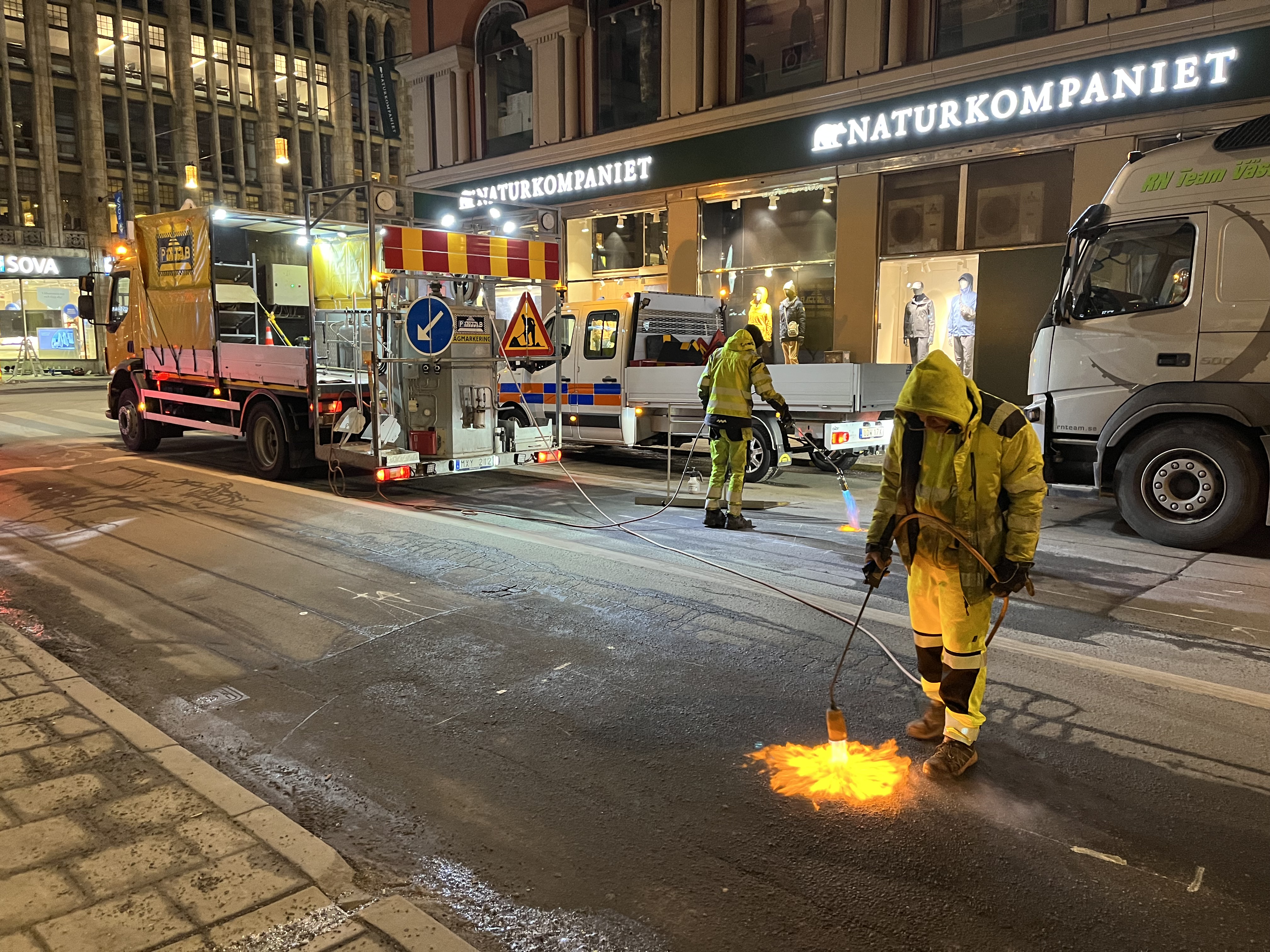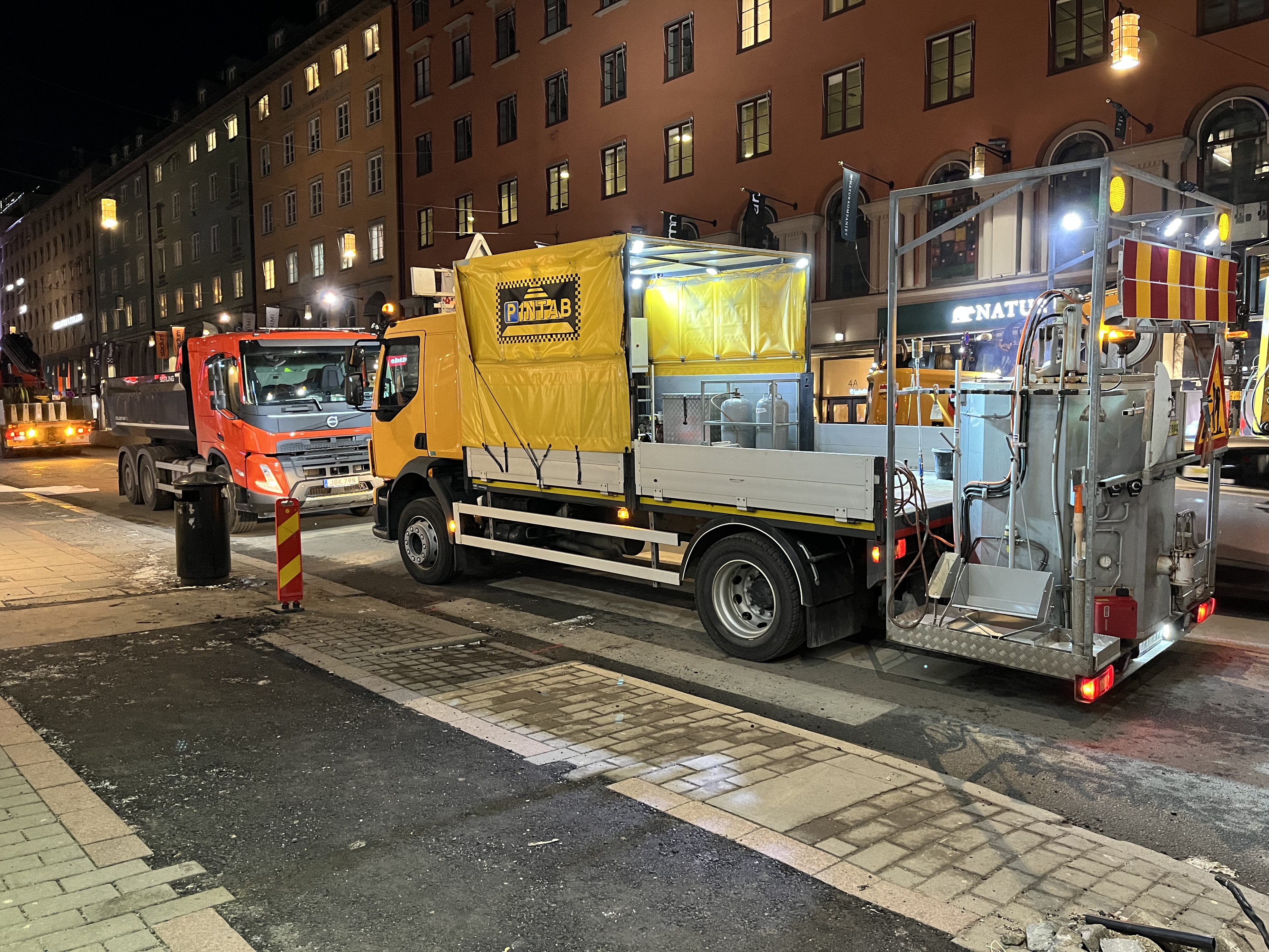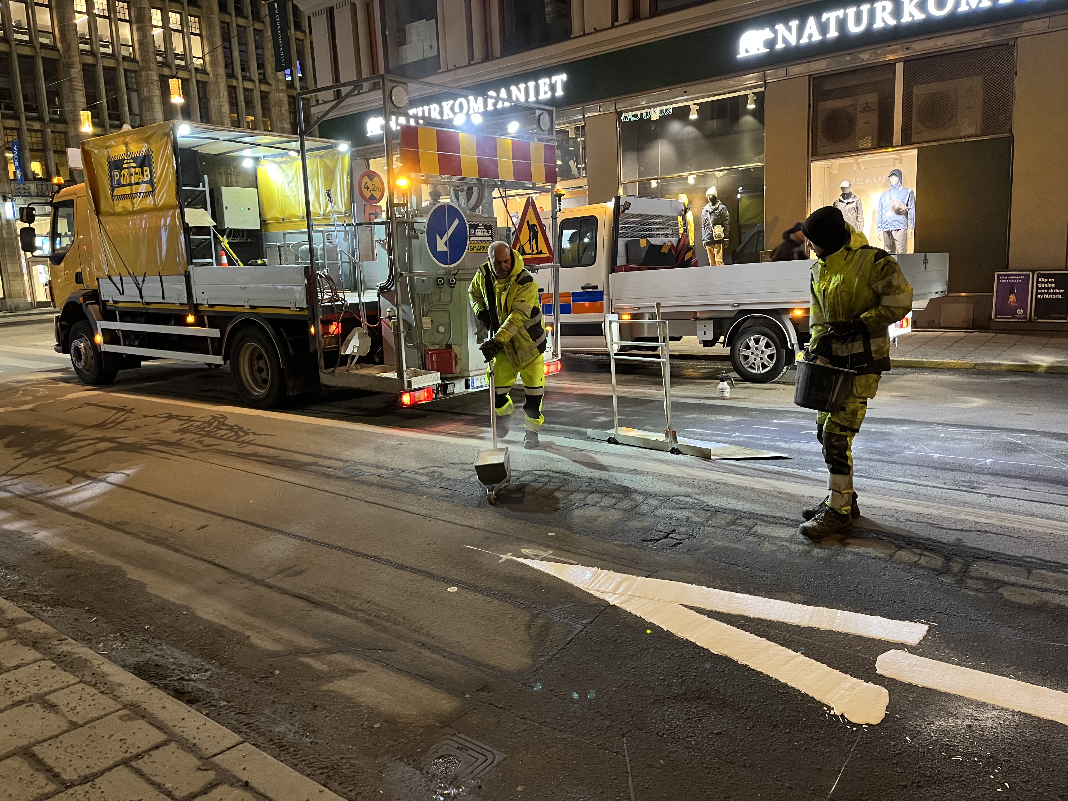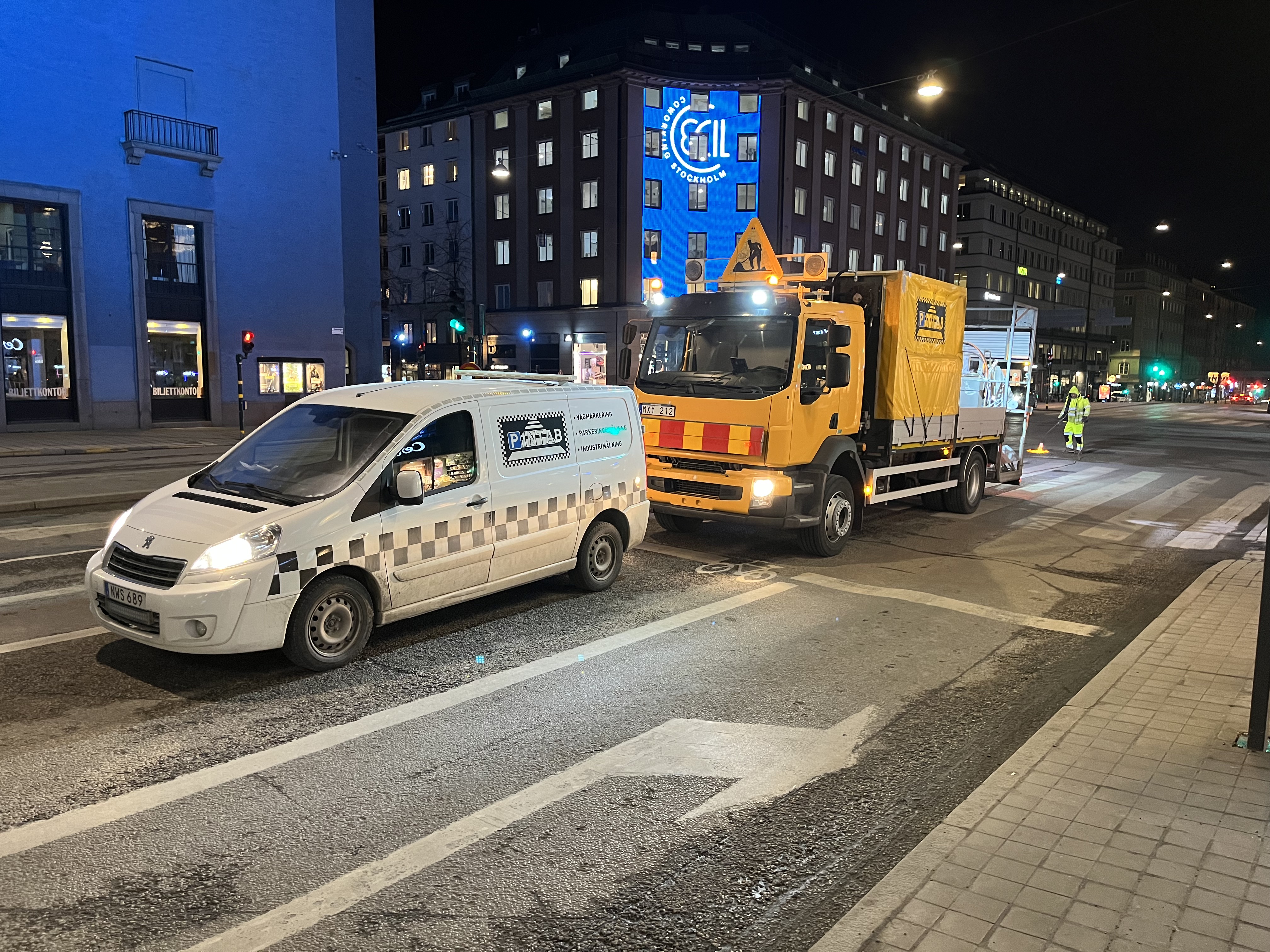 Vi utför tvär- och längsgående vägmarkering med termoplastisk vägmarkeringsmassa. Termoplastmassan hettas upp till 200 grader och läggs ut med handskopor eller extruderbil. Linjerna läggs med tjocklek på ca: 3 mm. Termoplasten innehåller 20% glaspärlor för att ge reflektans. Vi målar vägar, parkeringar gång- och cykelbanor mm.