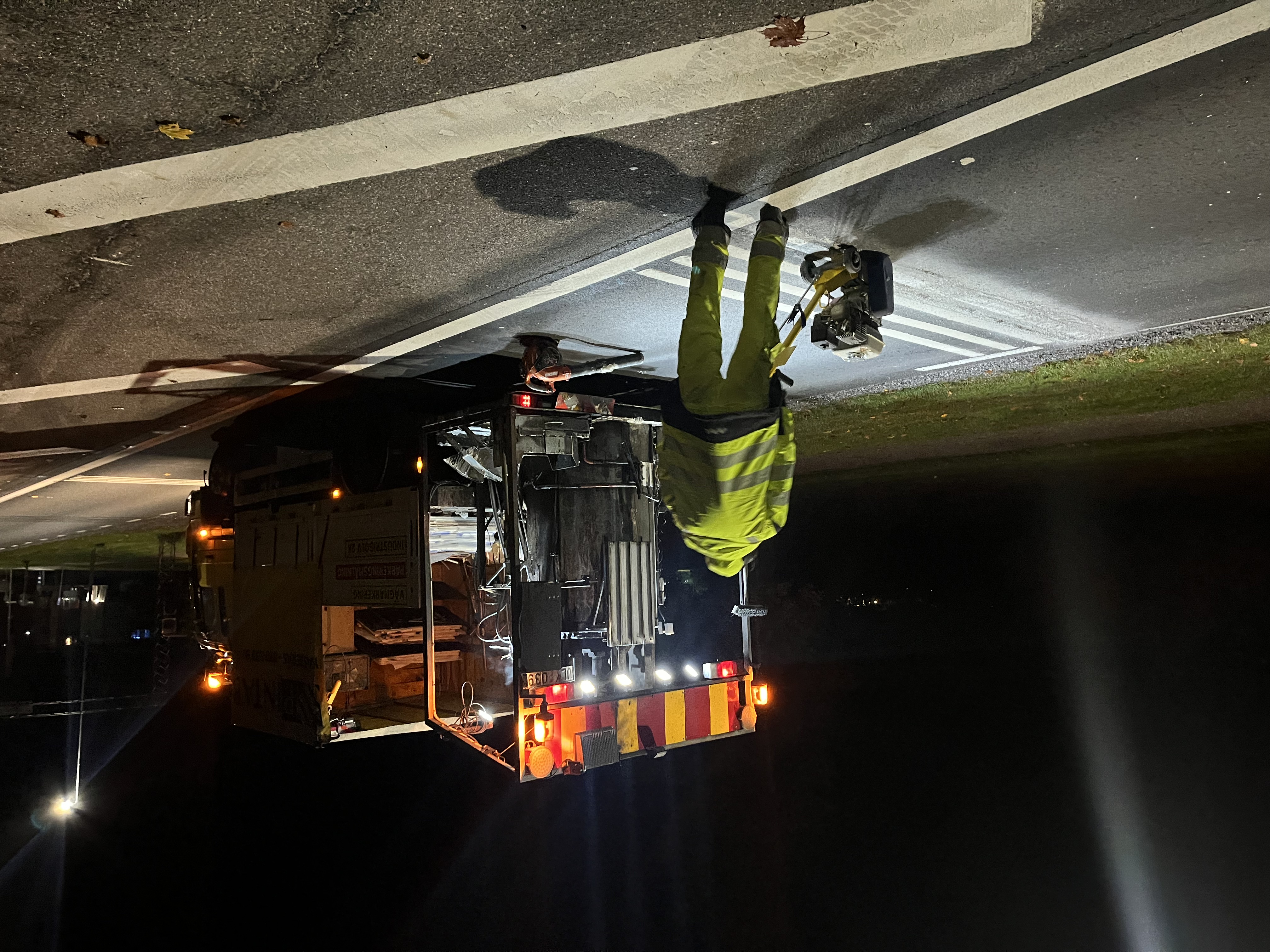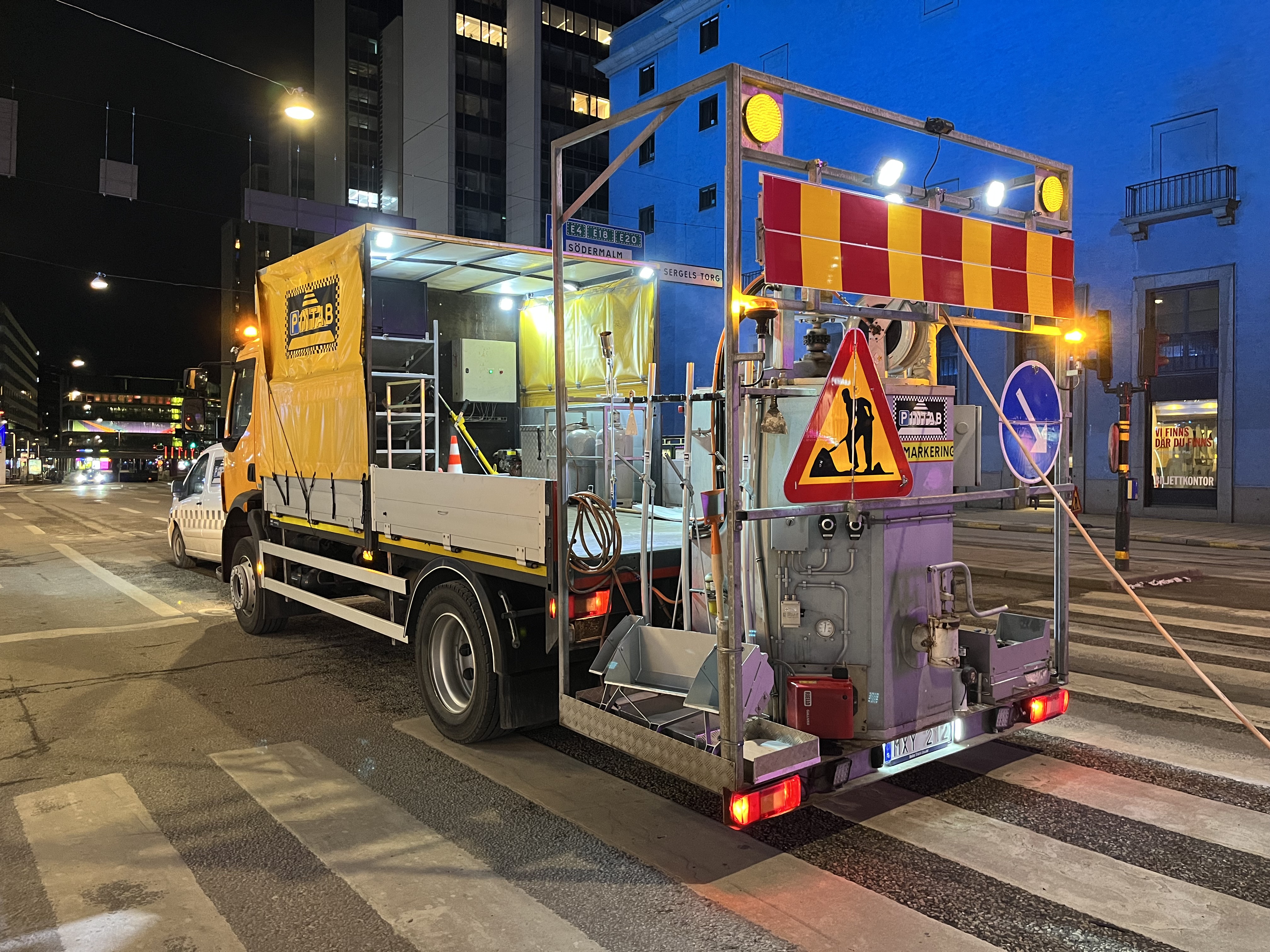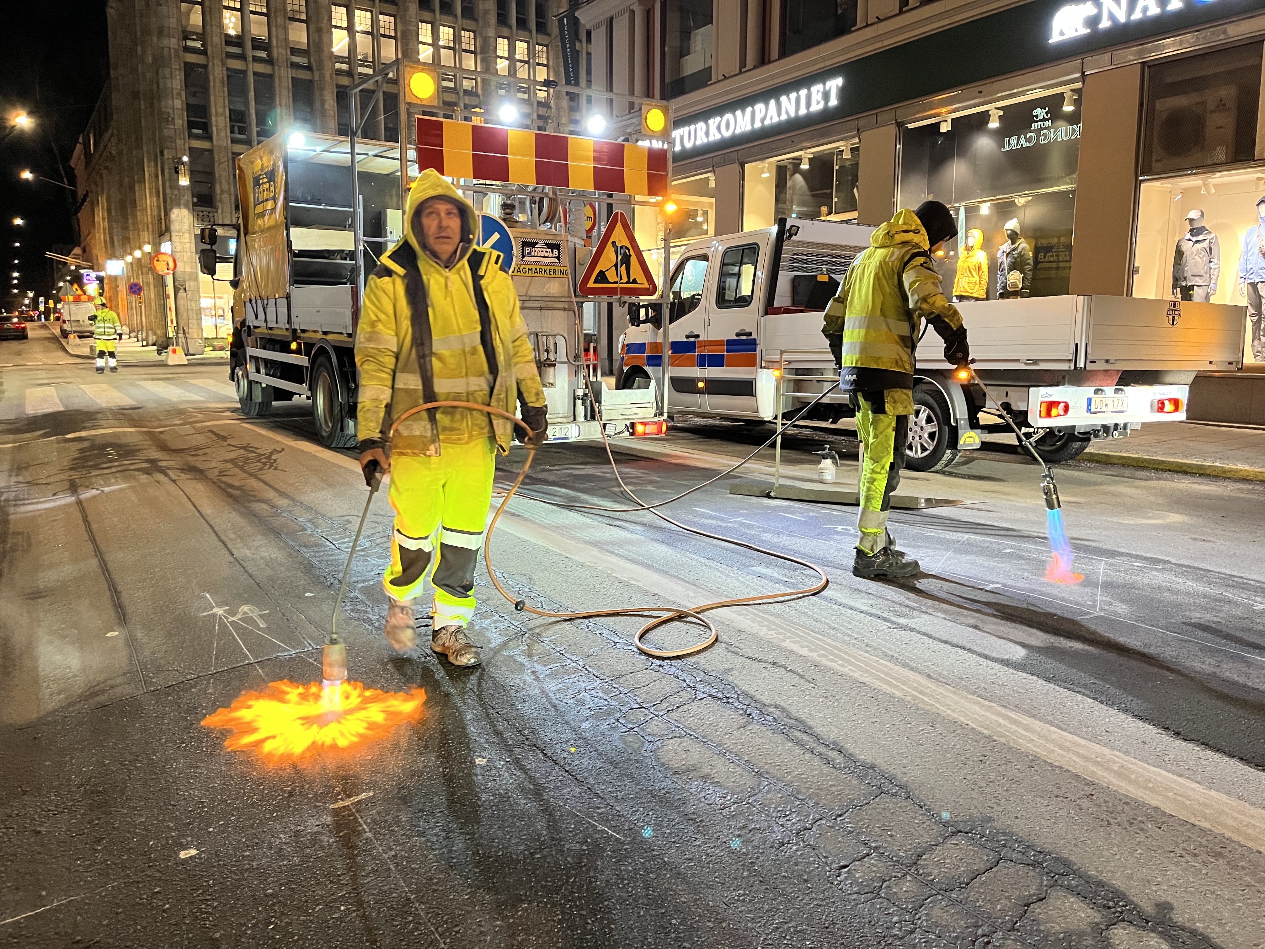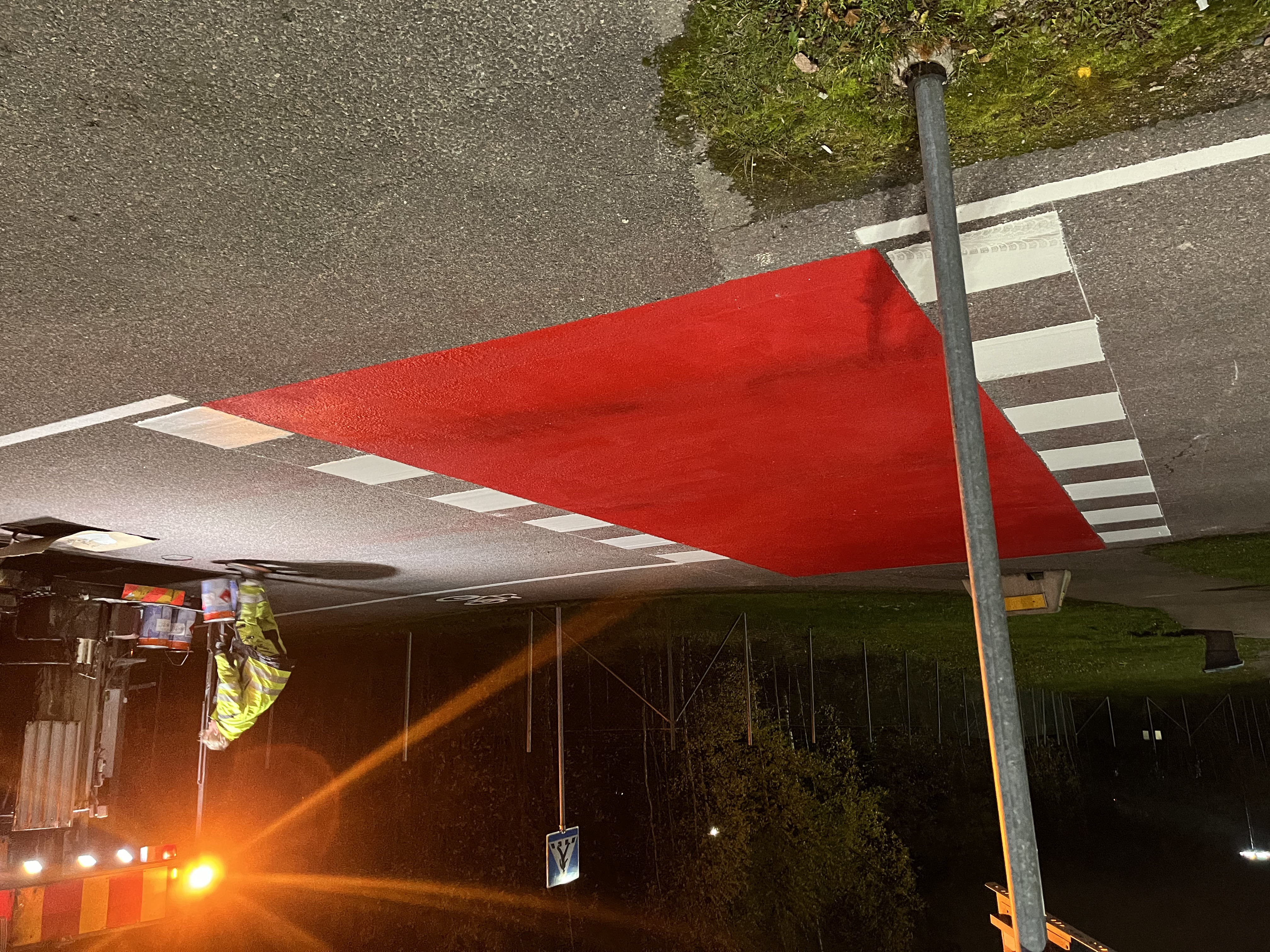 Vi utför tvär- och längsgående vägmarkering med termoplastisk vägmarkeringsmassa. Termoplastmassan hettas upp till 200 grader och läggs ut med handskopor eller extruderbil. Linjerna läggs med tjocklek på ca: 3 mm. Termoplasten innehåller 20% glaspärlor för att ge reflektans. Vi målar vägar, parkeringar gång- och cykelbanor mm.