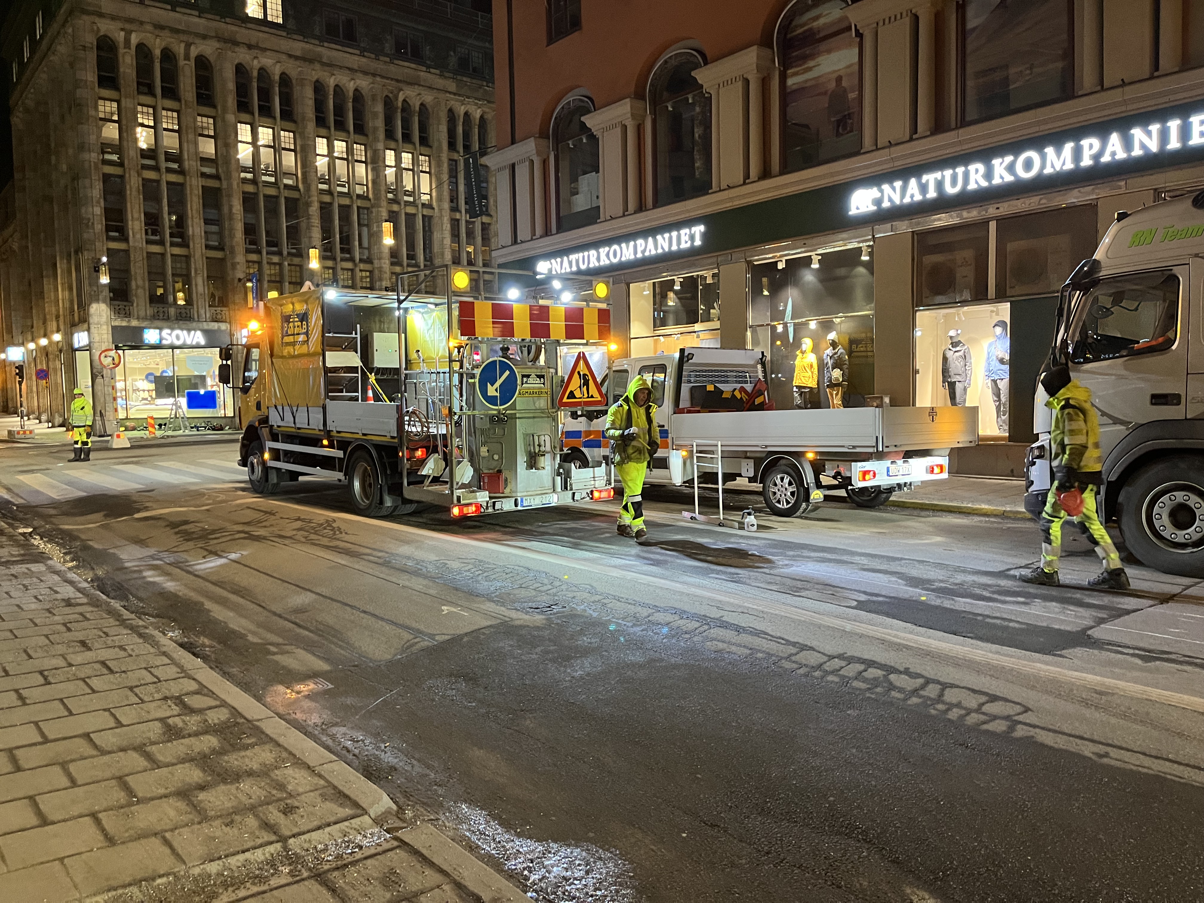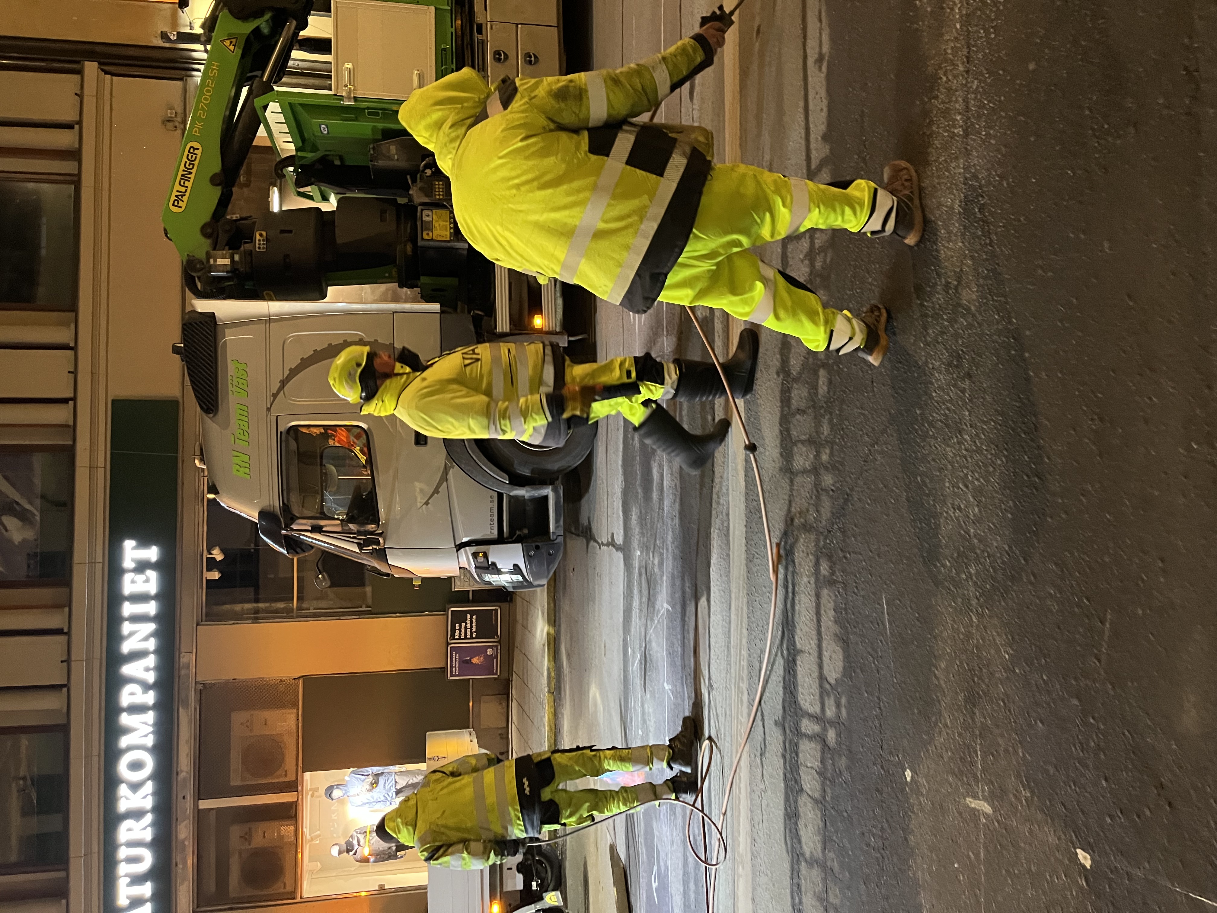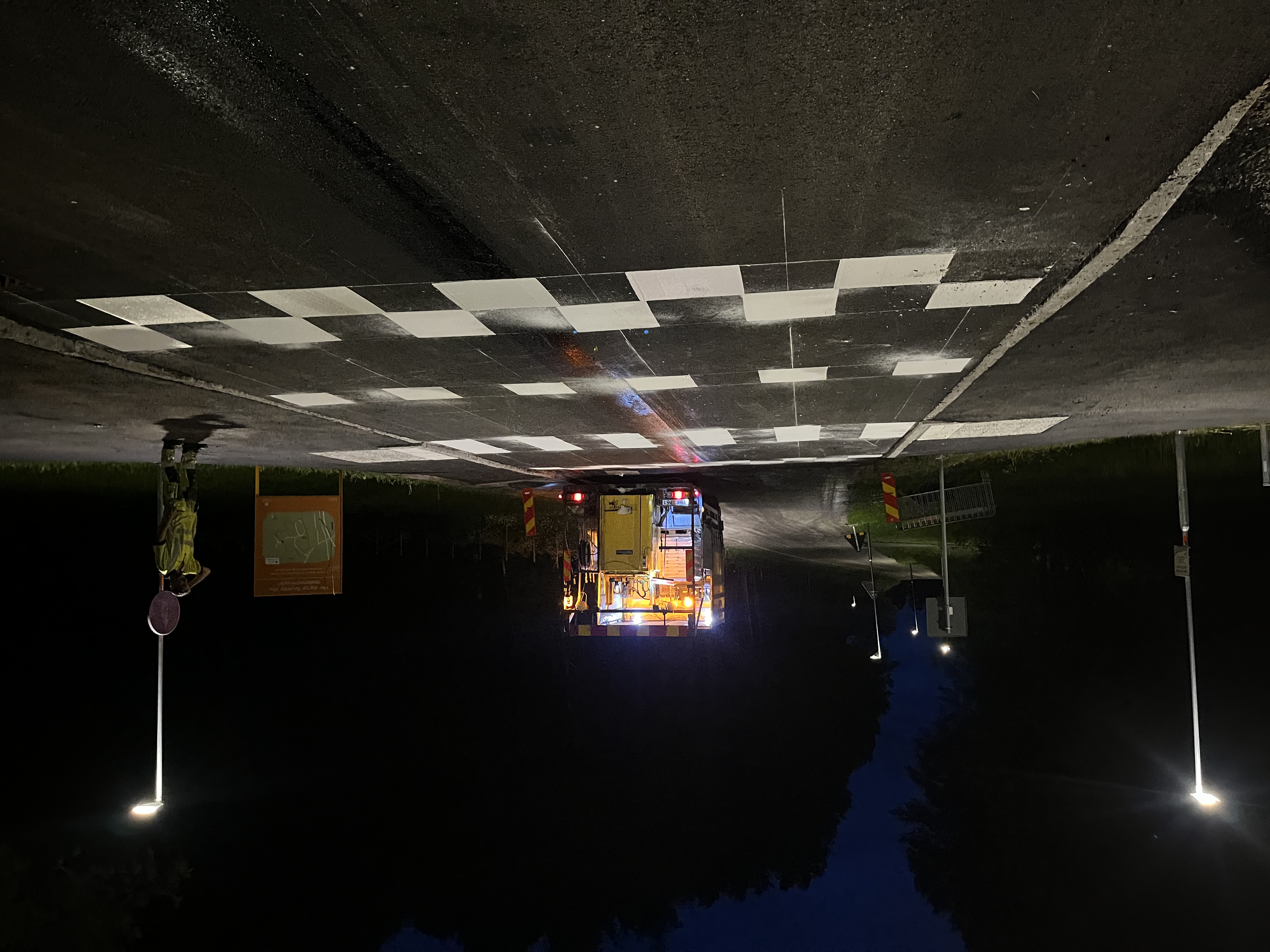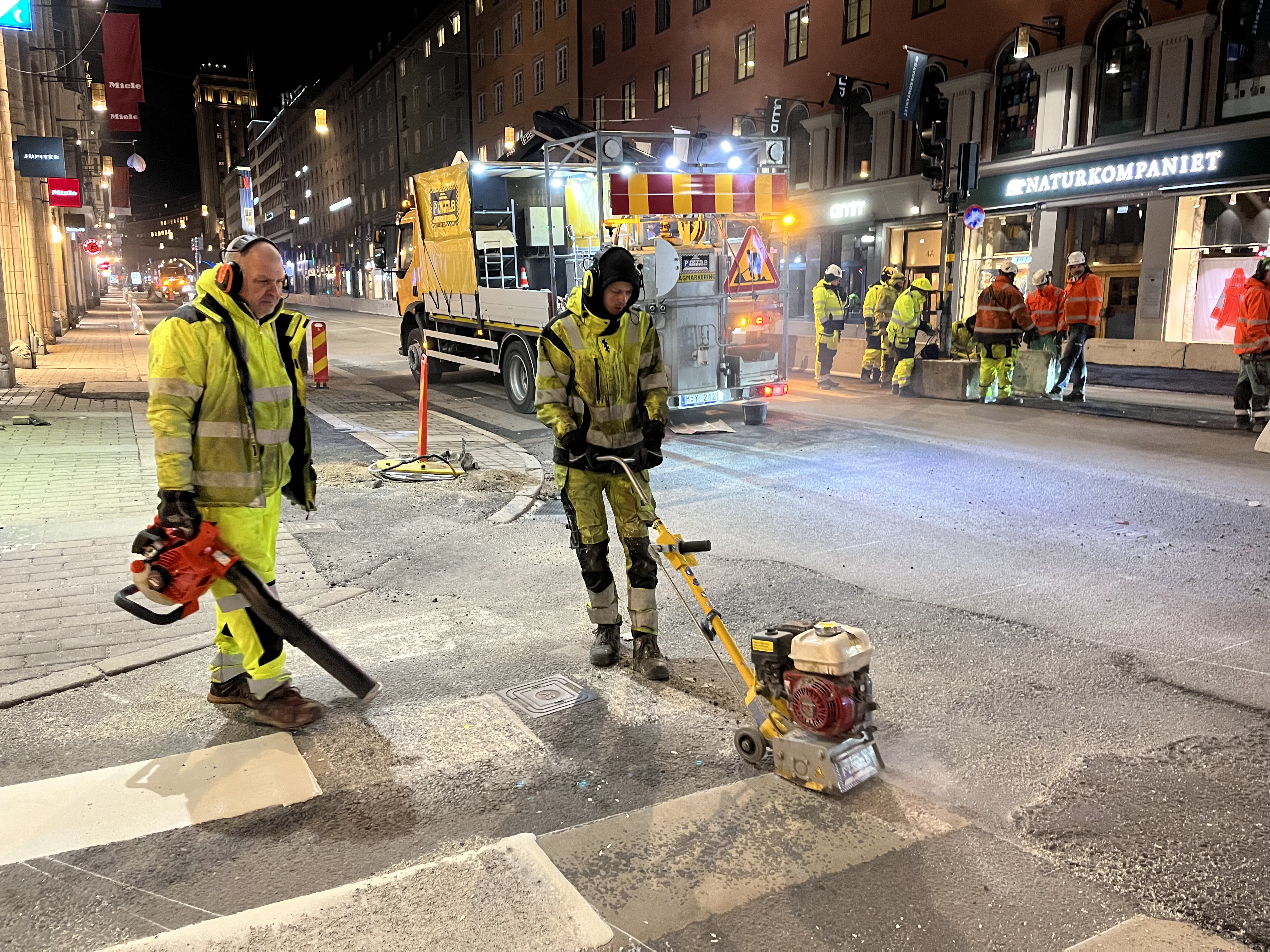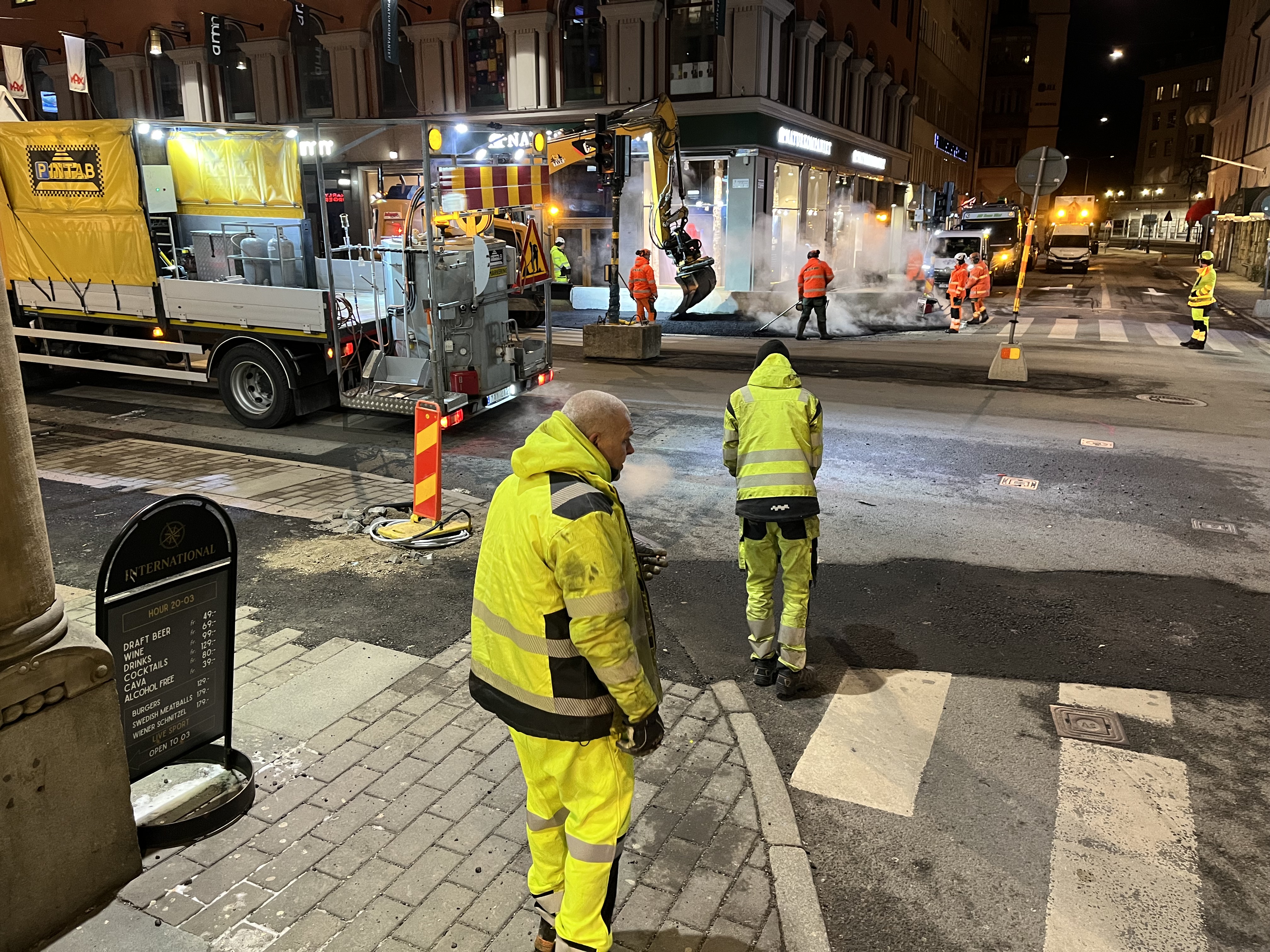 Vi utför tvär- och längsgående vägmarkering med termoplastisk vägmarkeringsmassa. Termoplastmassan hettas upp till 200 grader och läggs ut med handskopor eller extruderbil. Linjerna läggs med tjocklek på ca: 3 mm. Termoplasten innehåller 20% glaspärlor för att ge reflektans. Vi målar vägar, parkeringar gång- och cykelbanor mm.